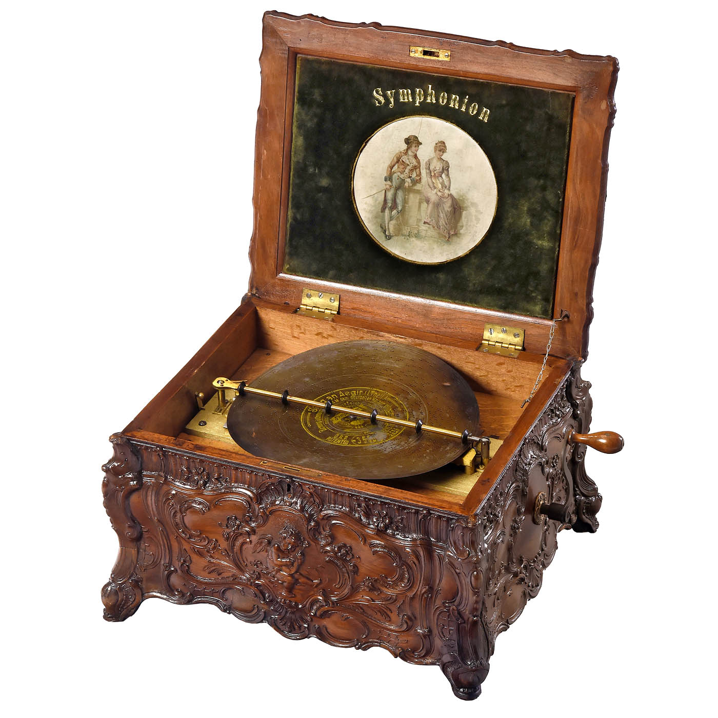 Symphonion Musikwerke, Leipzig. With duplex combs of 84 teeth (complete), in pressed walnut bombé case decorated with swags, flowers, musical trophies and figures, the inner lid with silk print of children gathering flowers, width 18 1/2 in. (47 cm), no case escutcheon, with crank and 2 discs. A beautiful example of this classic Symphonion in luxury case!