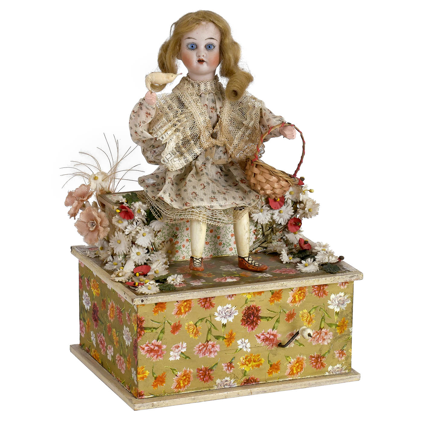 Probably Sonneberg, Germany, depicting a girl with a bird, with bisque head by Armand Marseille incised "AM 90 Dep, Germany", open mouth, fixed bright-blue glass eyes, mohair wig, carved and painted wood lower limbs, cotton dress and basket, seated on paper-covered base decorated with fabric flowers, the hand-turned musical movement playing "Für Elise" as the figure turns from side to side, ht. 10 ½ in. (27 cm), working.