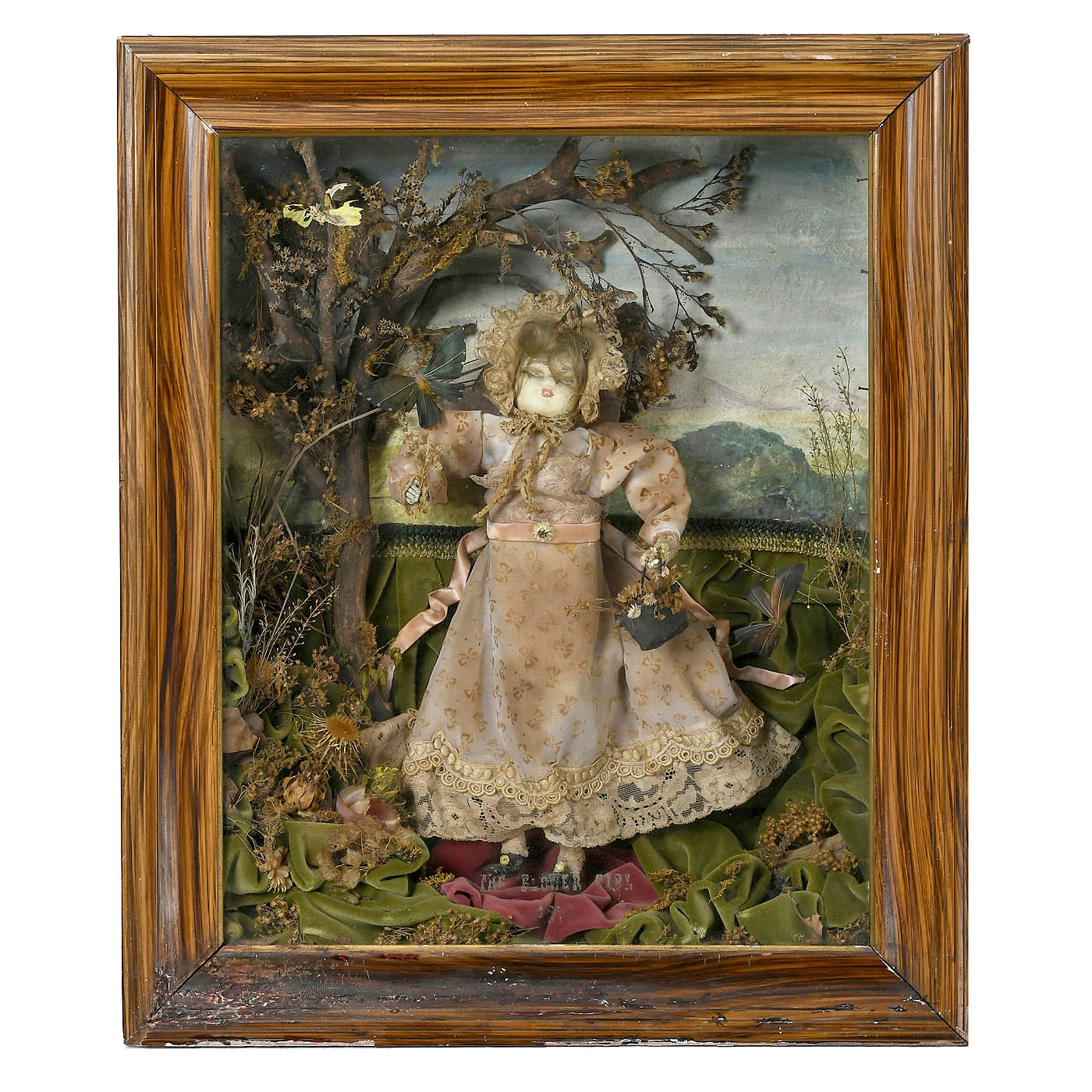 Depicting a girl with basket and butterfly in landscape with flowers, grasses and a tree, in grained frame with facsimile "Tiffany Studios" label and small cylinder musical movement causing the figure to move her upper body and her feet, frame 20 x 24 in. (51 x 61 cm), working condition, lower section of frame scuffed.