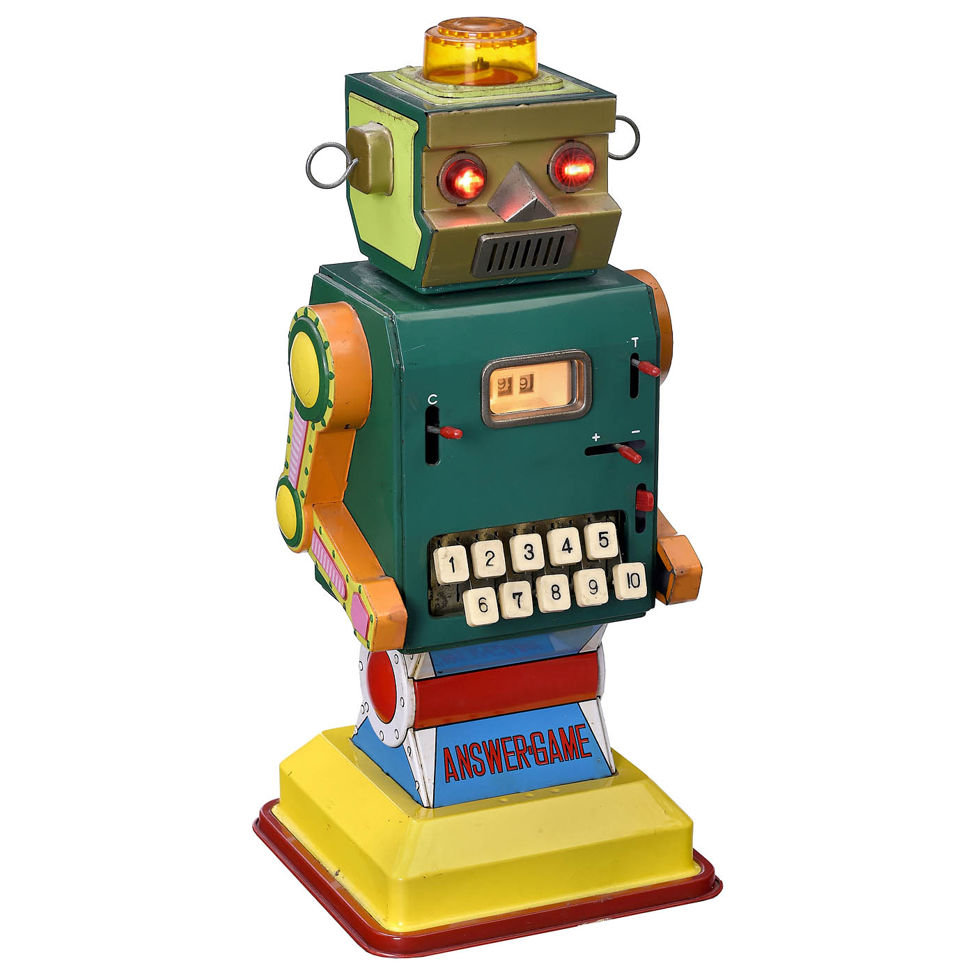 Ischida, Japan. Mainly tin construction, with blinking eyes and revolving disc in head, 14 in., gear mechanism for calculating functions, battery drive, 2-row key board, good working condition. - Note: This large robot is a fascinating working calculator capable of adding and subtracting. - Literature: "Battery Toys", Exton/USA, 1984, p. 96. - "Roboter", Paris, 1978, graph 85. - "Toy Auction Price Guide", # 478. - "Roboter-Weltraum-Spielzeug", Augsburg, 1993, p. 29. - D. Hultzman, "Collecting Battery Toys", 1994, p. 6.