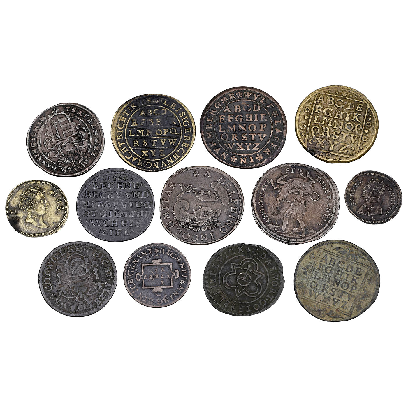 1) "A. DELPHINO. INCOLUMITAS", Nuremberg, Ø 25 mm. - 2) Nuremberg, Wolf Laufer, with arithmetic master at the arithmetic table, Ø 27 mm. - 3) "RECHNE RECHT VND NIT ZV VIL GOT GIBT DIR AVCH EIN ZIEL", probably Gotha, reverse with ten-part coat of arms shield, Ø 24 mm. - 4) "DAS WORT GOTTES BLEIBT EWICK", Hans Krautwickel, Nuremberg, reverse with 3 crowns, alternating with 3 lis, arranged around a central rose, Ø 23 mm. - 5) "ASSIDVITATE ET TOLERANTIA", Nuremberg, Wolf Laufer, reverse turtle with sails, Ø 22 mm. - 6) "WAS GOT WIEL GESCHICHT ALLZEIT", Saxony-Alt-Weimar, Ø 23 mm. - 7) "VENUS", Ioh Lauer, Nuremberg, reverse with 2 cupids, Ø 18 mm. - 8) "RECHENPFENNING BIN ICH GENANT - ZAIG OFT AN GROS EER U SCHAND", Germany, Ø 20 mm. - 9) "SCHWARZENBERG", Nuremberg, Ø 17 mm. - 10) "CONSIDERA NOVISSIMA ET NON PECCABIS", Brunswick, motif of hourglass on skull with snakes, Ø 24 mm. - And: 11) 3 further Nuremberg arithmetic pennies with arithmetic master at the arithmetic table.