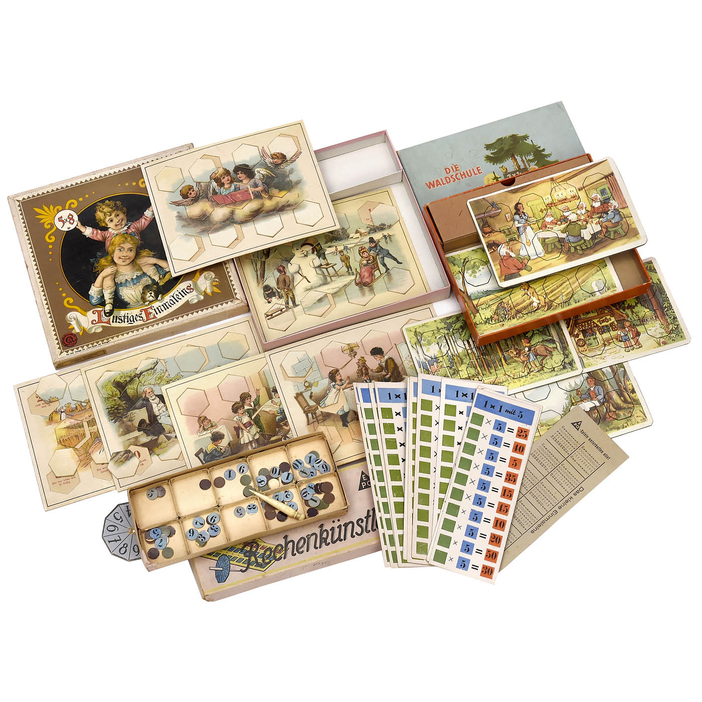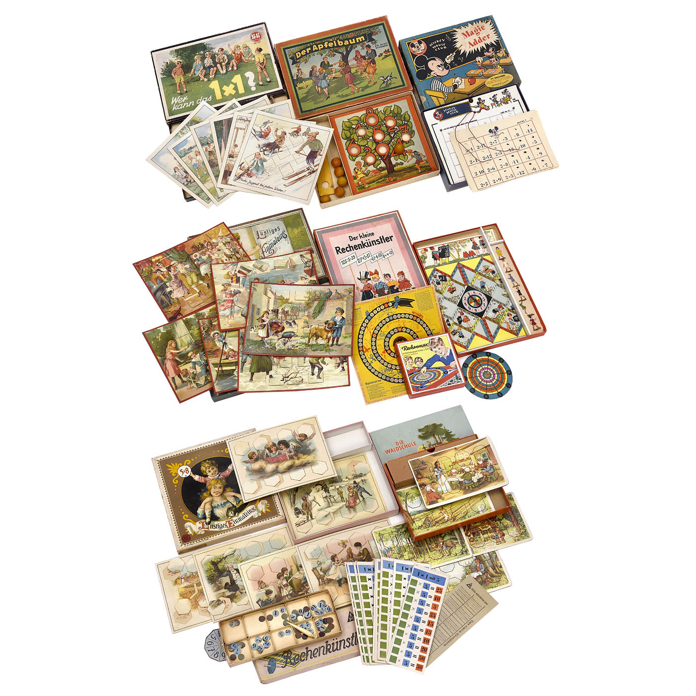 1) Lustiges Einmaleins, c. 1925, Sala Rotsiegel game, No. 4131, with 6 cards. - 2) Wer kann das 1 x 1?, c. 1940, Si-Si Spiele, No. 131, with 6 cards. - 3) Lustiges Einmaleins, c. 1920, Heimchen Spiele, No. 4262, with 6 cards. - 4) Die Waldschule, c. 1955, VEB Spielefabrik, No. 218, with 5 cards. - 5) Rechenmax, c. 1930, Schulspiel-Verlag Kuhlemann, with game board and turning wheel. - 6) Der kleine Rechenkünstler, c. 1930, Klee Verlag, with game board and 7 pewter figures (1 damaged). - 7) Mickey Mouse Club Magic Adder, c. 1955, Jacmar Games, New York, quiz game with 10 cards, electrical functions not tested. - 8) Der kleine Rechenkünstler, c. 1935, Epo Spiele, with 10 boards and number tiles. - And: 9) Der Apfelbaum, c. 1947, Brückner Spiele, with playing field, ramp and 6 wood balls.