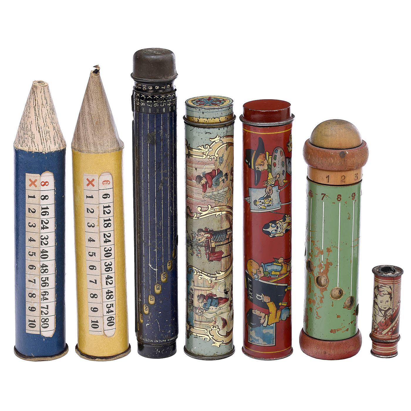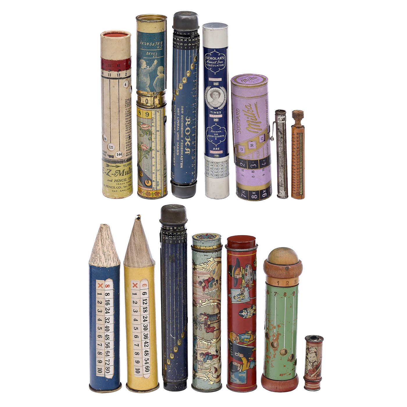 1) "Roka - Der rechnende Federkasten", Germany, c. 1930, lithographed tin cylinder with multiplication table and section for writing instruments. - 2) Darnley's "Patent Rotatable Lightning Calculator", England, c. 1930, similar to Roka. - 3) Keim & Co, Nuremberg, c. 1920, calculator drum, with lithographs of children playing. - 4) Milka "Le Calculateur", France, c. 1960, card drum. - 5) Keim & Co, Nuremberg, c. 1950, calculator drum, with lithographs of playing children. - 6) "E-Z-Multiplier", U.S. Pencil Co., c. 1930, card drum. - 7) JEP, France, c. 1930, small calculator drum with pencil sharpener, lithographed tin. - 8) American Can Co., c. 1920, lithographed tin. - 9) "Multifix", Germany, c. 1930. - 10) "Scholar's Pencil Box Calculator", England, c. 1955, with portrait of Queen Elizabeth. - And: 11) 4 further calculator drums.