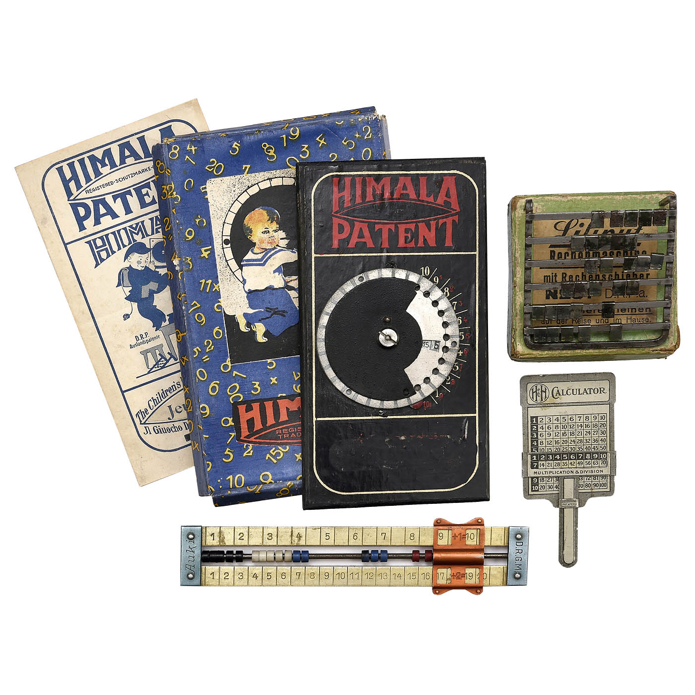 1) "Himala Patent", 1920 onwards, D.R.P. 335921, Heinrich Funke, Munich, single-digit column or digit adder, with instructions in box. - 2) "Liliput Rechenmaschine", c. 1925, with slide rule, in box. - 3) "H & H Calculator", sheet metal board with sliding bar, for the 4 basic arithmetic operations. - And: 4) "Auki", c. 1930, Germany, adding aid with counting rings.