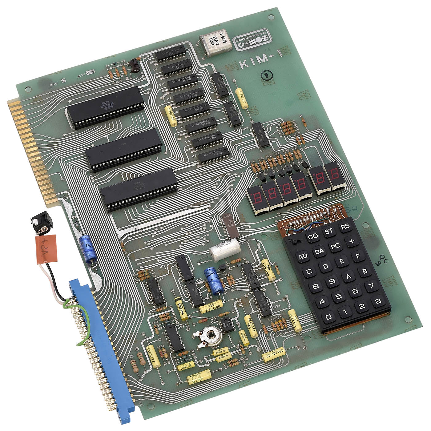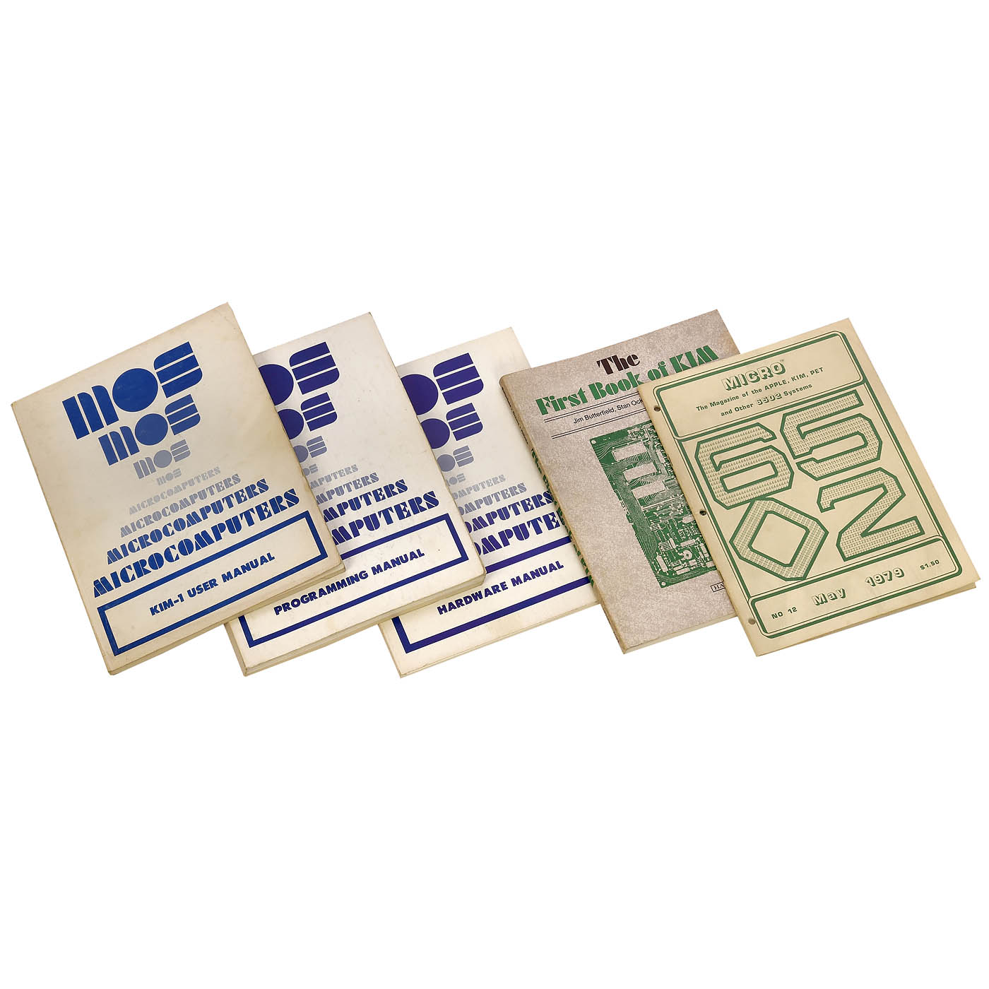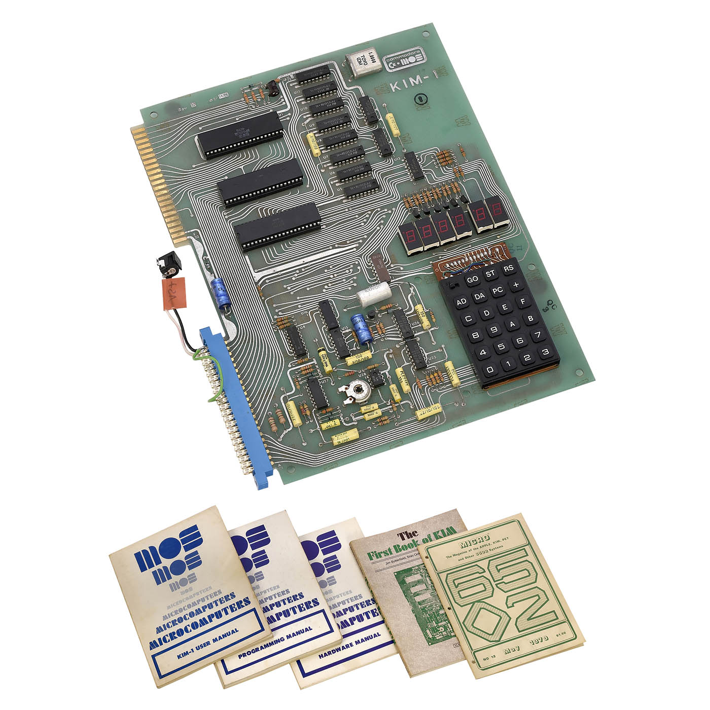 Commodore/MOS Technology, Pennsylvania. Single-board home computer without housing, with single MHz 6502 microprocessor, operating system on 2 KB read-only memory, 64 bytes RAM, 1 KB main memory, six-digit 7-segment LED display MAN72A, 23 keys for entering hexadecimal code and power supply unit, working condition. - With the following books: "The First Book of KIM", "MOS Microcomputers Programming Manual", "MOS Microcomputers KIM-1 User Manual", "Micro - The Magazine of the Apple, KIM, PET and other 6502 Systems" and "MOS Microcomputers Hardware Manual".
