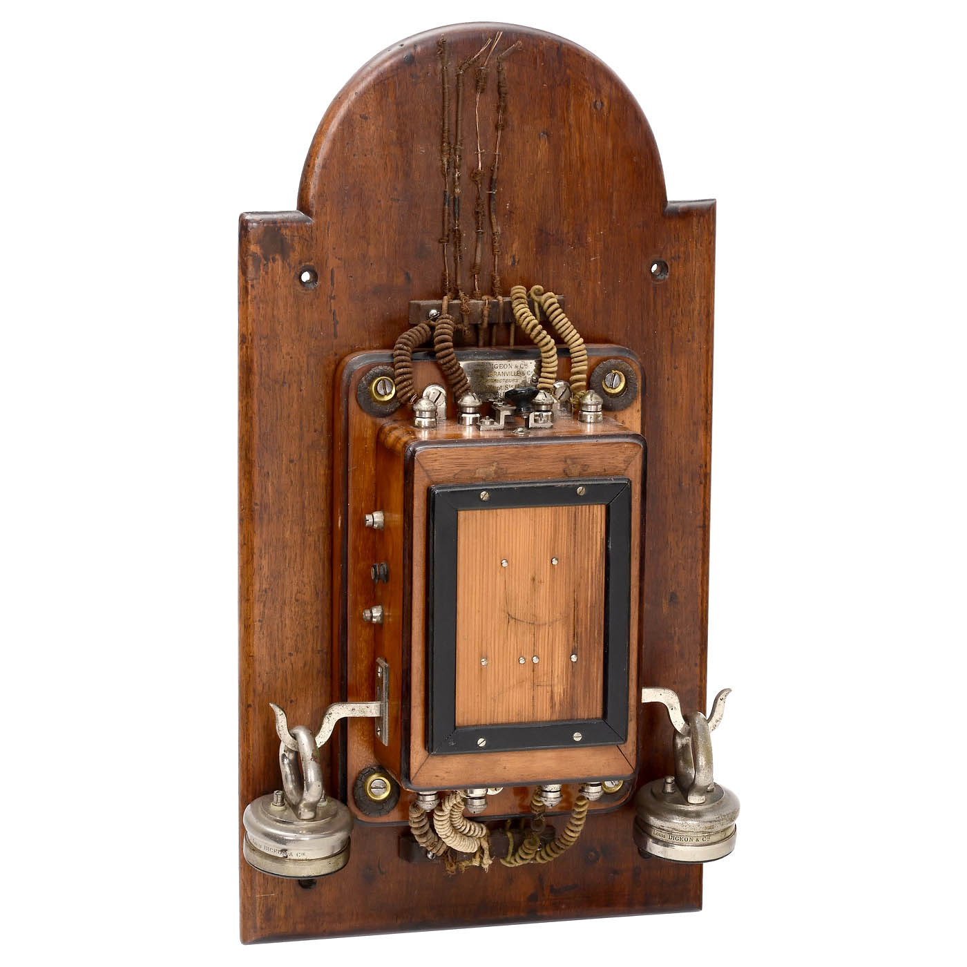 Louis Digeon & Cie, Paris. Système Branville et d'Arsonval, carbon barrel microphone with pine wood membrane, 2 earphones (missing wires), marked "Système Aubry, Louis Digeon & Cie". - A very rare telephone, in good condition!