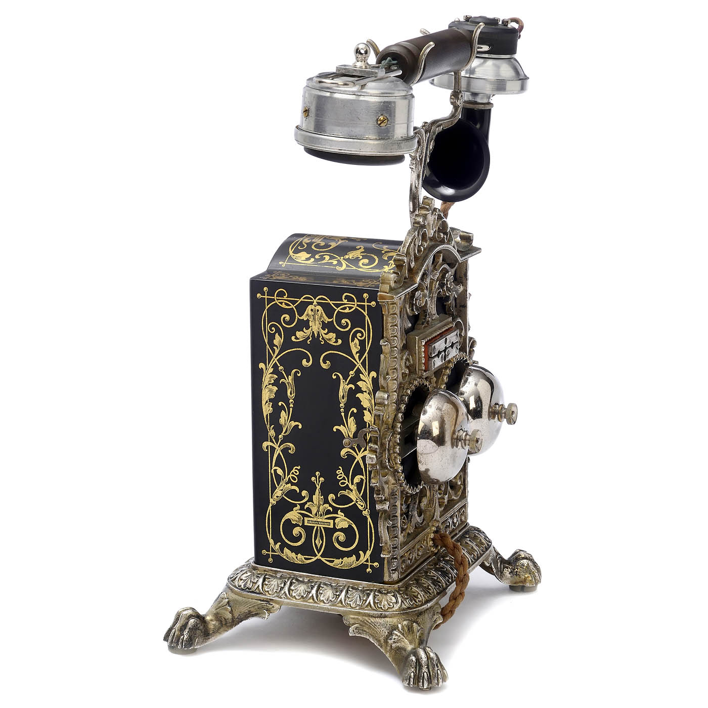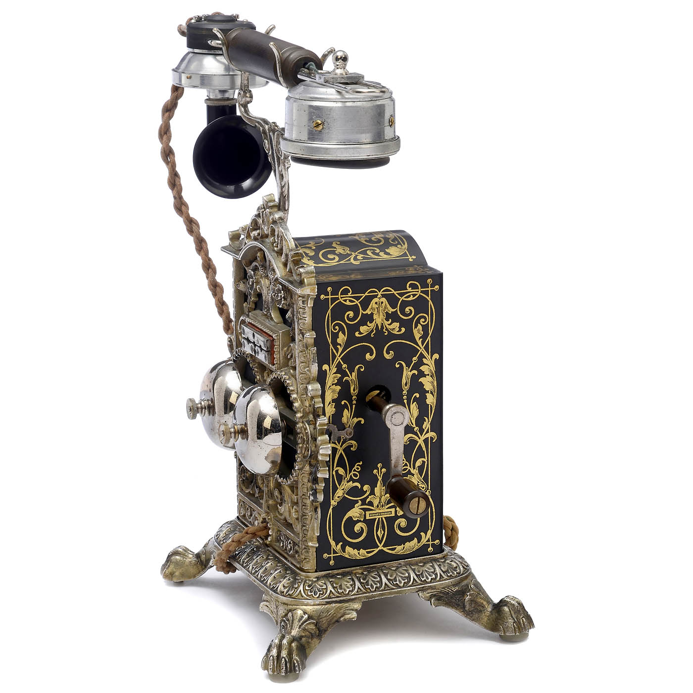 Table model, Øyan's patent, no. 10535, nickel-plated cast-metal front and base, tin case with gilt decoration and manufacturer's label, original cradle and handset. - One of the most beautiful and desirable of early table telephones.