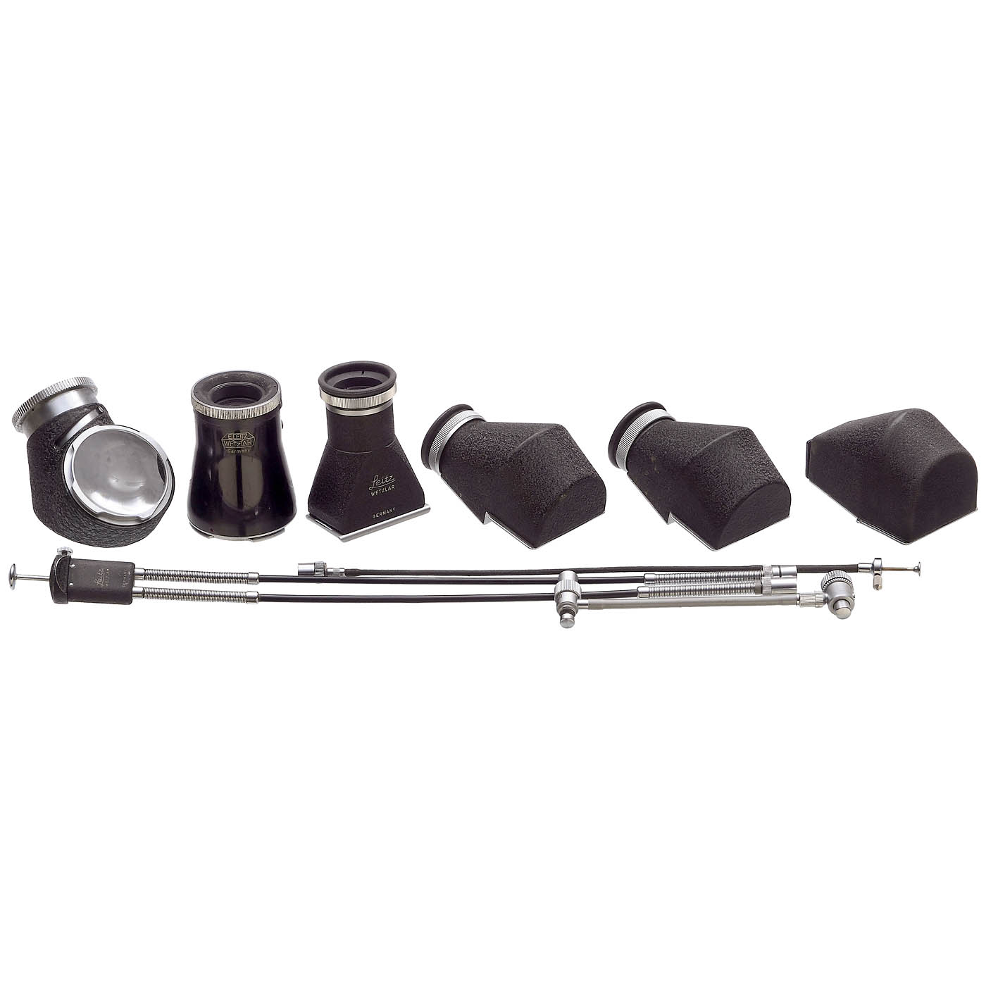 Leitz, Wetzlar. 1) Hektor 6.3/2.8 cm no. 580215, c. 1941, optics good under point light. (3+/3+) - 2) Elmar 3.5/3.5 cm no. 678138, c. 1948, optics good under point light. (3/3+) - 3) Elmar 4/9 cm no. 221697, c. 1934, chrome. (3/3) - 4) Elmar 4/9 cm no. 839424, c. 1950, narrow "leather ring", minor cleaning marks/scratches. (3/3-) - 5) Telyt 4.5/20 cm no. 1548093, c. 1958, with lens hood and special cap, optics clean under point light, approx. 0.5 mm separation along the entire edge (insignificant in practice). (3/2-) - 6) Telyt 4.8/280 mm Canada no. 2217171, c. 1966, optics clean under point light. (3-/2-) - 7) Visoflex I no. 35768 with 3 different viewfinder magnifiers: PAMOO, PEGOO and LVFOO. (3/3) - 8) 4 viewfinders for Visoflex I/II: 2 x OTXBO, OTVXO and 16499. (3/3) - 9) 3.5cm mirror viewfinder SBLOO/12010 with leather case. (3-/3-) - 10) Self-timer APDOO/14003 with case. - 11-12) Cable release OZWTO and FINOT/14070. - 13) Cable-release connection OZXVO/16493. - 14) 5 cassettes IXMOO/14006 with plastic containers. - 15) BELUN close-up device for Elmar 5 cm. - 16) Adjustment device for 5 cm lens, stand only. - And: 17) 4 different Leica base plates: IIIA, IIIc, IIIf-IIIg and M3.