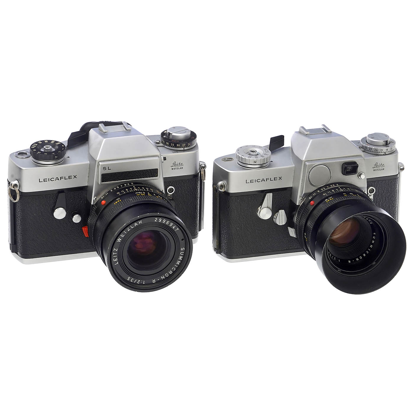 Leitz, Wetzlar/Canada. 1) Summicron-R 2/35 mm, c. 1979, no. 2996947, minor film on front edge when viewed under point light, irrelevant for use. (3-/3) - 2) Leicaflex no. 1119077, the first SLR by Leitz, c. 1965, with "bean-shaped" image counter, Summicron-R 2/50 mm no. 2273872, retaining ring 14160 and lens hood 12564, optics clean under point light. (3/3) - 3) Summicron-R 2/50 mm, c. 1980, no. 3047578, marked "FOR LEICA R ONLY ", optics clean under point light. (3+/3+) - 4) Lens adapter 14127 F for Visoflex M on Leica R. (3/3) - And: 5-6) Leicaflex SL no. 1215780, dents on the housing, shutter works, and Leica R3 MOT no. 1496873 with Winder R3, electrics untested. (4/-)