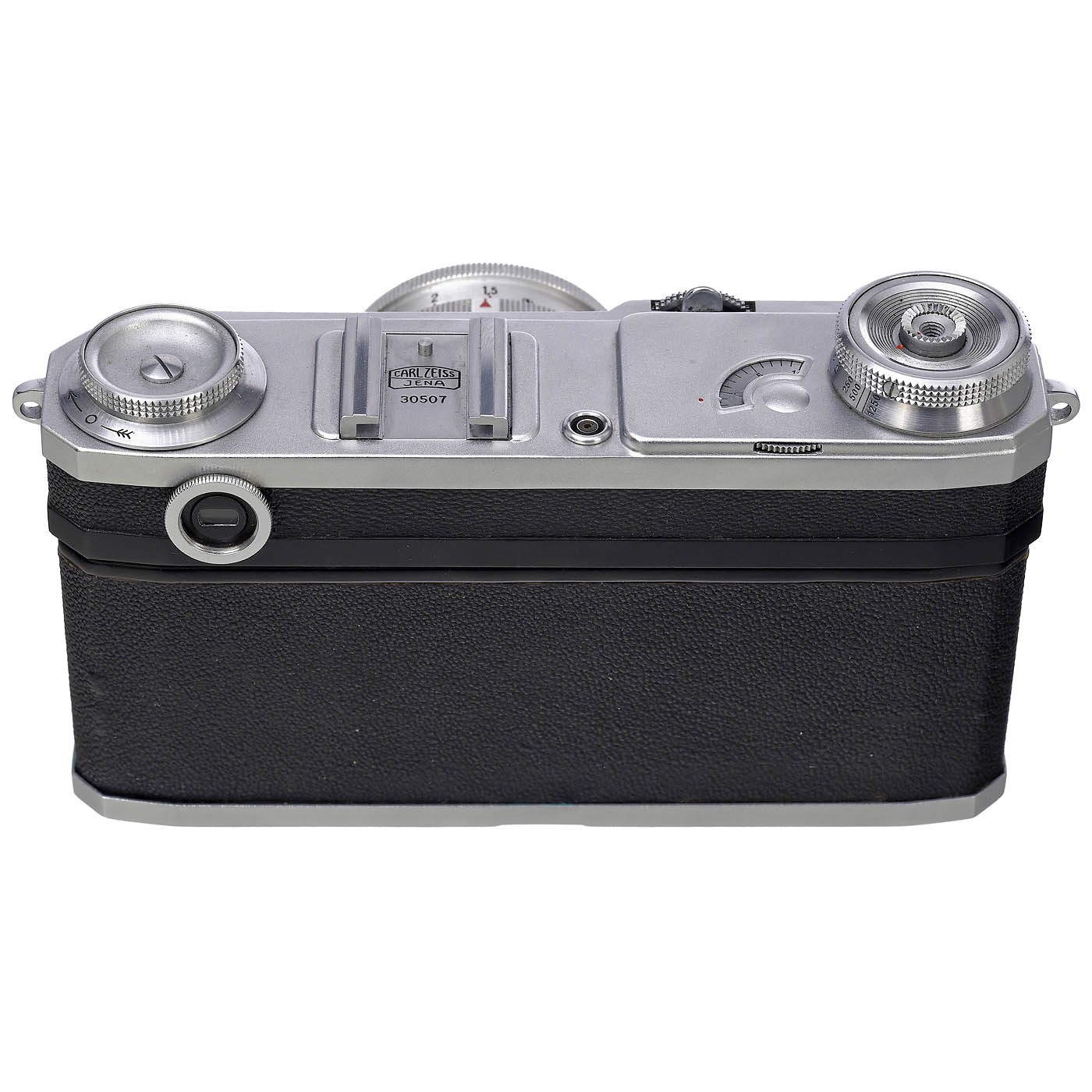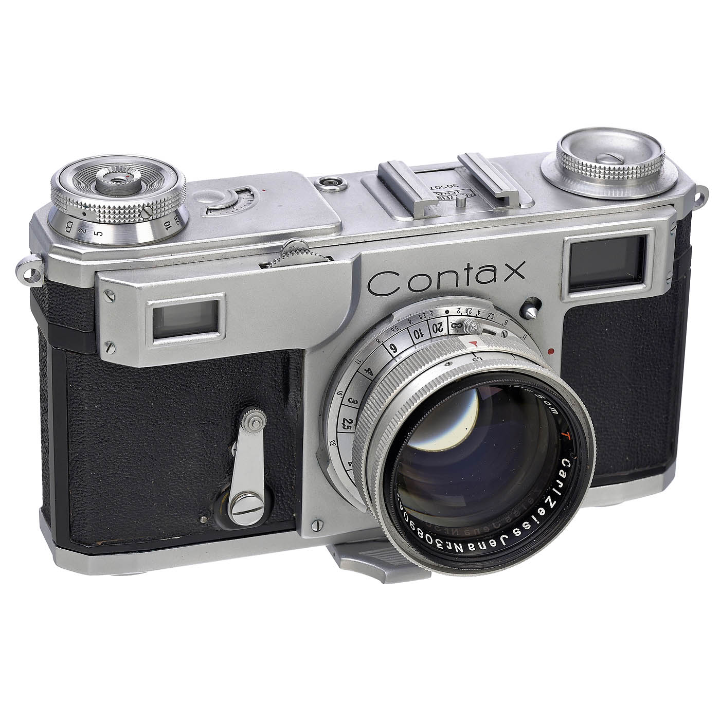 Carl Zeiss, Jena. Contax II, with engraving in the accessory shoe: "Carl Zeiss Jena 30507", with Carl Zeiss Jena Sonnar 1.5/5 cm T lens no. 3089042, marked "Germany" on barrel, synchronization next to accessory shoe, with case, optics clean under point light, shutter and rangefinder smooth and accurate. - Excellent, near-mint condition. - Note: After the end of the Second World War, the Zeiss manufacturing plant was dismantled and reassembled for production in the USSR with accompanying "technology transfer". The difficult situation was heightened by the potential loss of the Zeiss brand name, the legal dispute between East and West Germany and the further development of the Contax II in Stuttgart (which had begun in Jena). The planned name "Volga" was replaced at the last moment by "Kiev". - A historical camera.