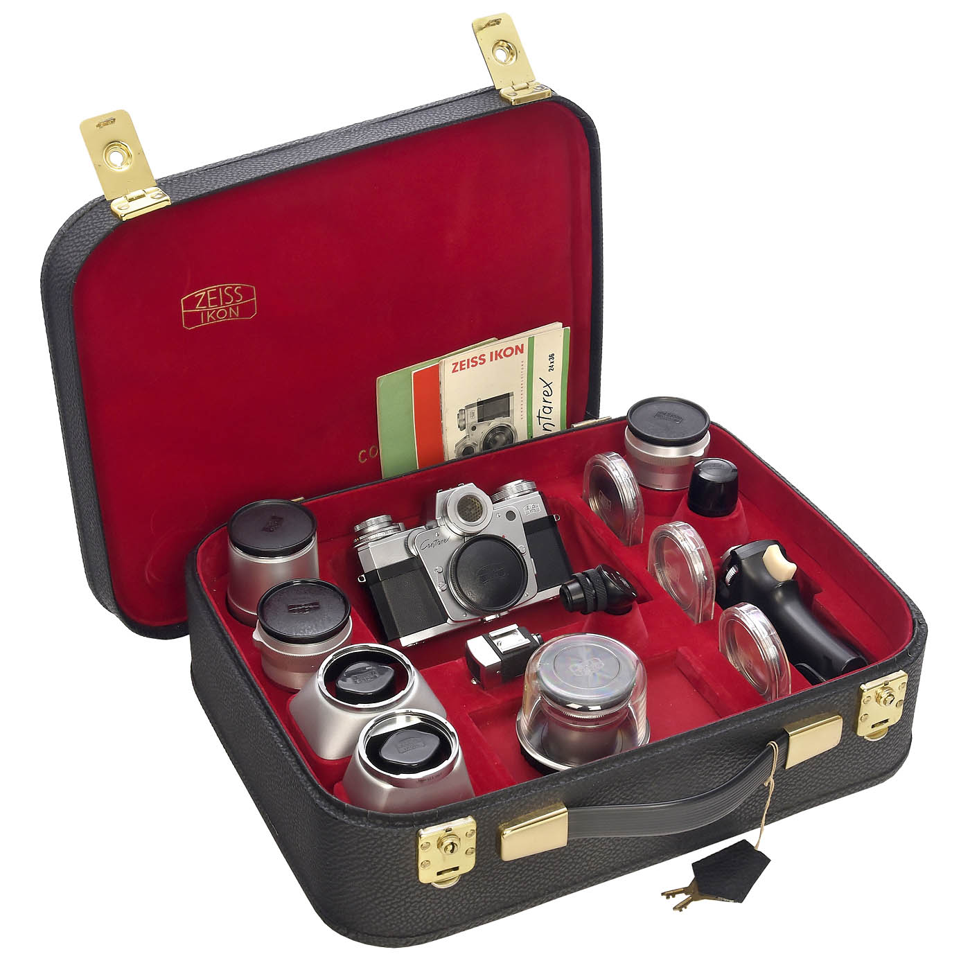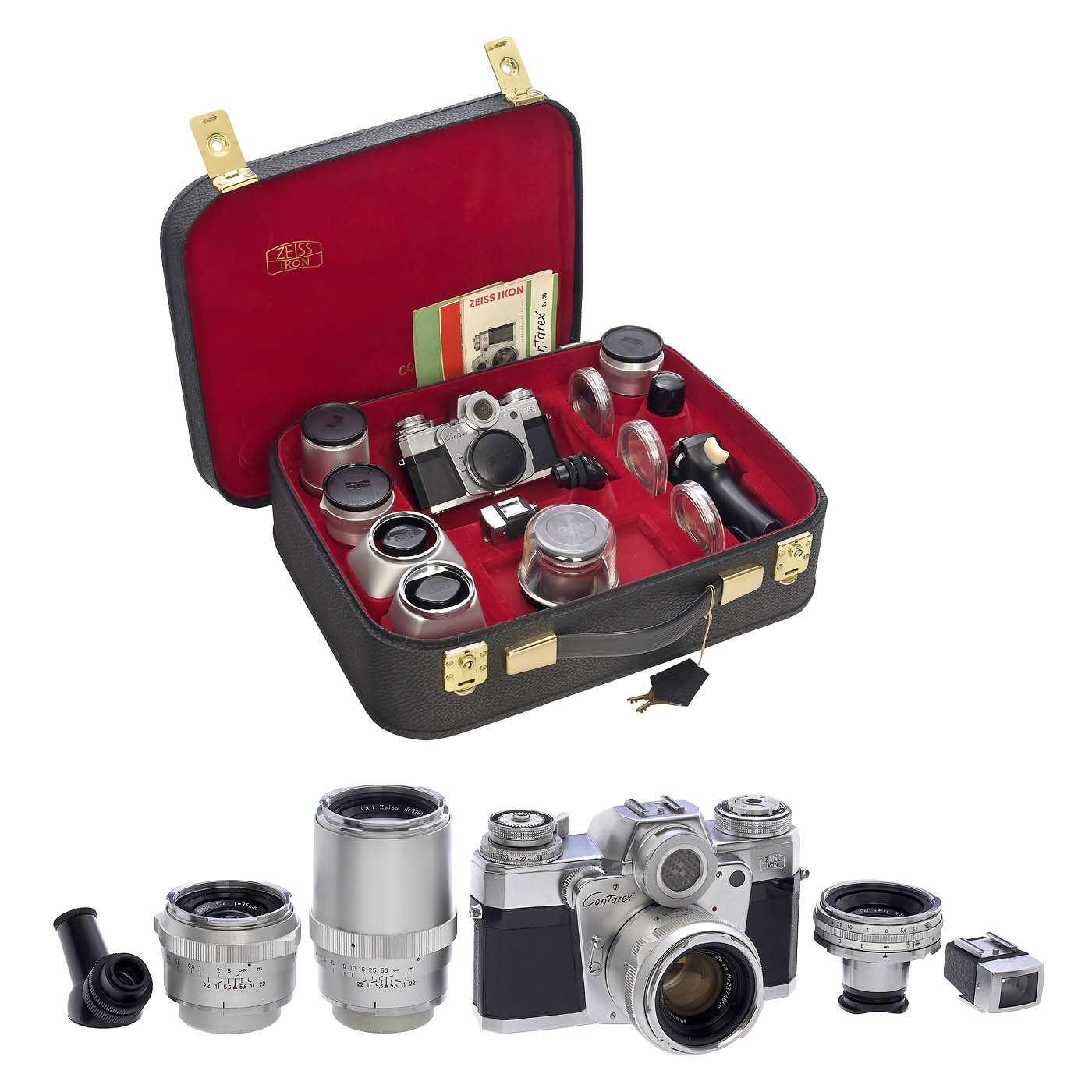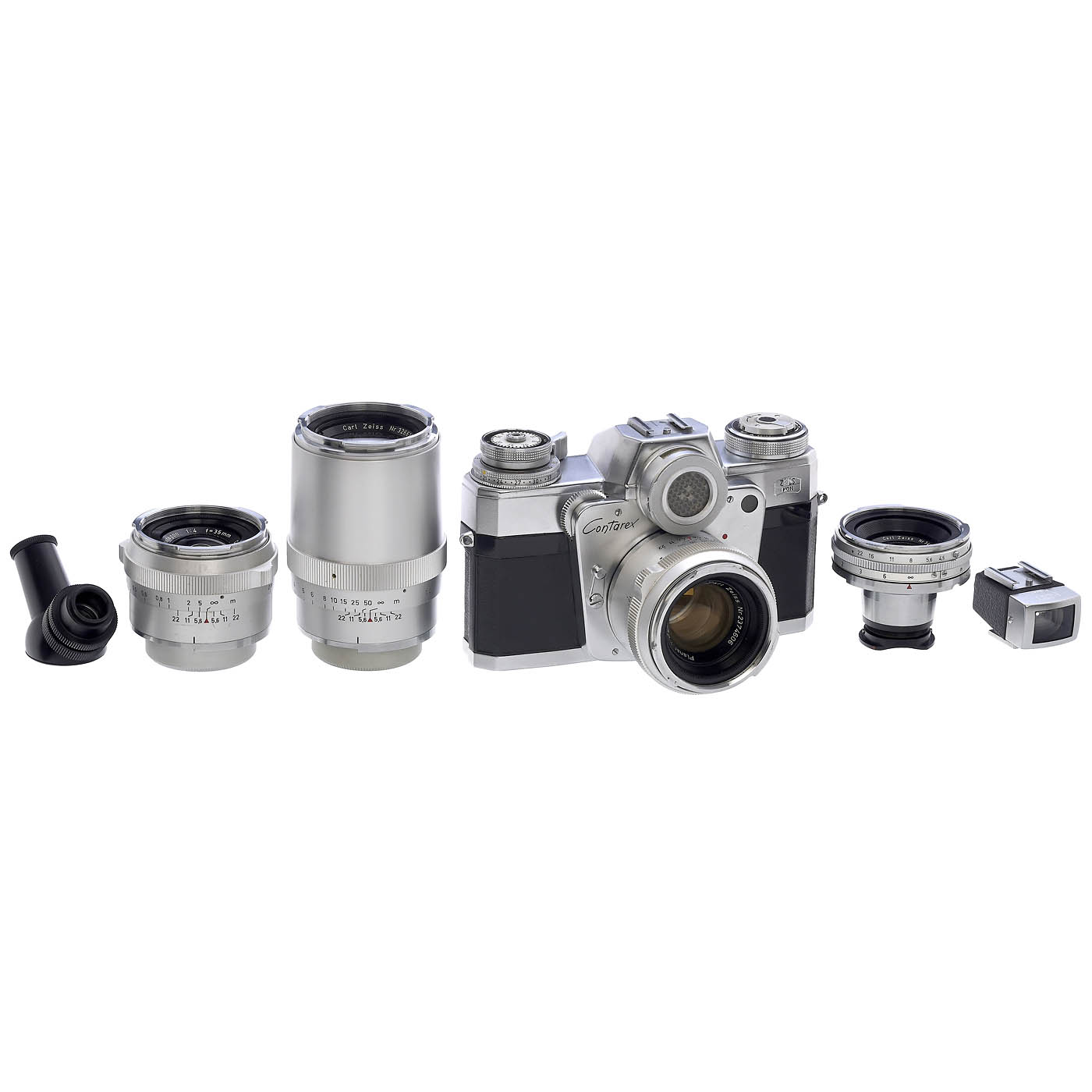 Zeiss Ikon, Stuttgart. 1) Contarex no. Z 48140, with body cap and case, shutter and light meter working. (2-/2-) - 2) Planar 2/50 mm no. 2374606, chrome feet-scale, optics clean under point light. (2/2) - 3) Biogon 4,5/21 mm no. 3448261, with tube, viewfinder f=21 mm type 435 and leather case, optics clean under point light. (2-/2-) - 4) Sonnar 4/135 mm no. 3266397, chrome, with tube, optics clean under point light. (2-/2-) - 5) Distagon 4/35 mm no. 3256592, chrome, with tube, front element with minor cement defect at the edge visible under point light, otherwise clean. (3-/3-) - And: 6) Fitted Contarex leather case for the complete outfit, with both sunshades, cartridges, angle-finder, 3 filters: Ikolor F, Ikolor C, Contapol and grip. (2-3/3)