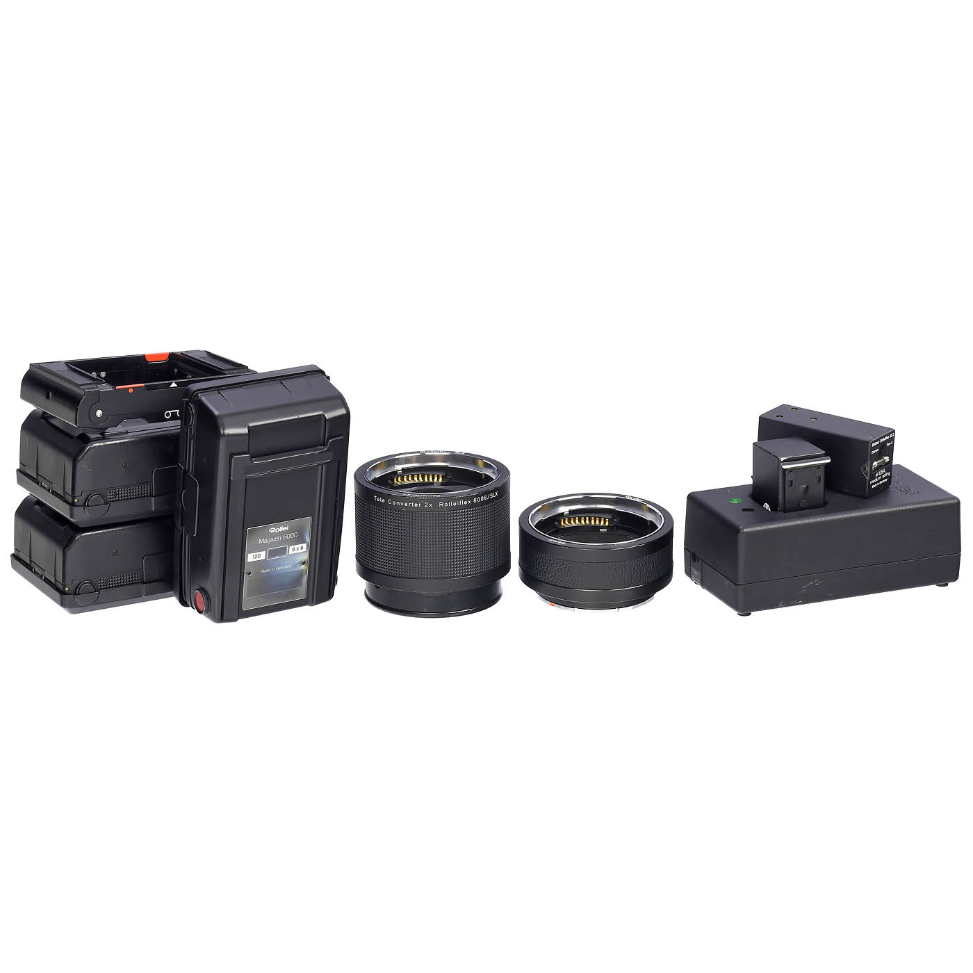 Rollei Fototechnic, Braunschweig. 1) Rolleiflex 6006 mod 2, no. 903280015, with Planar 2.8/80 mm no. 8078360 with setting lever, Rollei UV filter, waist-level finder, 120 6 x 6 magazine, charger and boxes, optics clean under point light, shutter release working, other functions untested. (3/-) - 2) Zeiss Distagon 4/40 mm no. 6182328, optics good under point light, inside the lens a 3mm piece of lint on the edge. (3/3) - 3) Sonnar 4/150 mm no. 8075700, with Rollei UV filter and box, optics clean under point light. (3/3+) - 4) Sonnar 5.6/250 mm no. 8081152, with box, optics clean under point light, focusing ring sticking. (3/3) - 5) 6006/SLX Tele Converter 2x, with packaging. (3+/3+) - 6) Rollei 34mm extension ring. (3+/3+) - 7) 3 6000/6006 magazines 120, 6 x 6 and an additional rollfilm insert, untested. (3/-) - 8) 6006 prism viewfinder. (3/3) - And: 9) Rollei universal lens hood 80-250 mm.