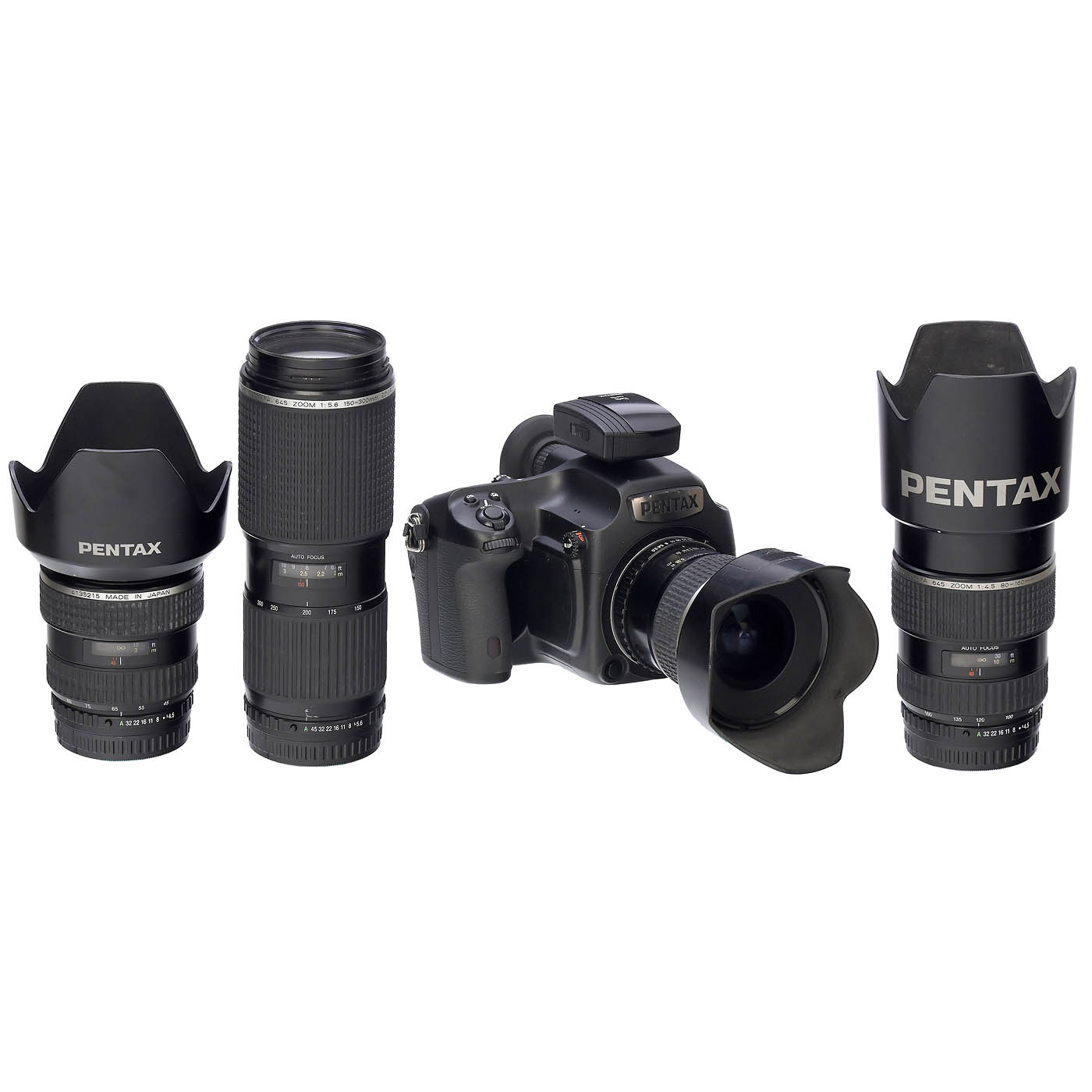Ricoh, Japan. Pentax 645 Z no. 6041620, CMOS-sensor 43,8 x 32,8 mm (up to 8256 x 6192 pixels) and lens hood, SMC Pentax-FA 645 3,5/35 mm AL (IF) and lens hood, SMC Pentax-FA 645 ZOOM 4,5/45-85 mm and lens hood, SMC Pentax-FA 645 ZOOM 4,5/80-160 mm and lens hood, and SMC Pentax-FA 645 ZOOM 5,6/150-300 mm ED (IF). All 4 lenses clean under point light, the autofocus works with all 4 lenses. - In addition: Camera strap, original camera box, charger with 4 batteries, German instructions with over 180 pages, and Pentax O-GPS1. - Enough pixels for every photographer!