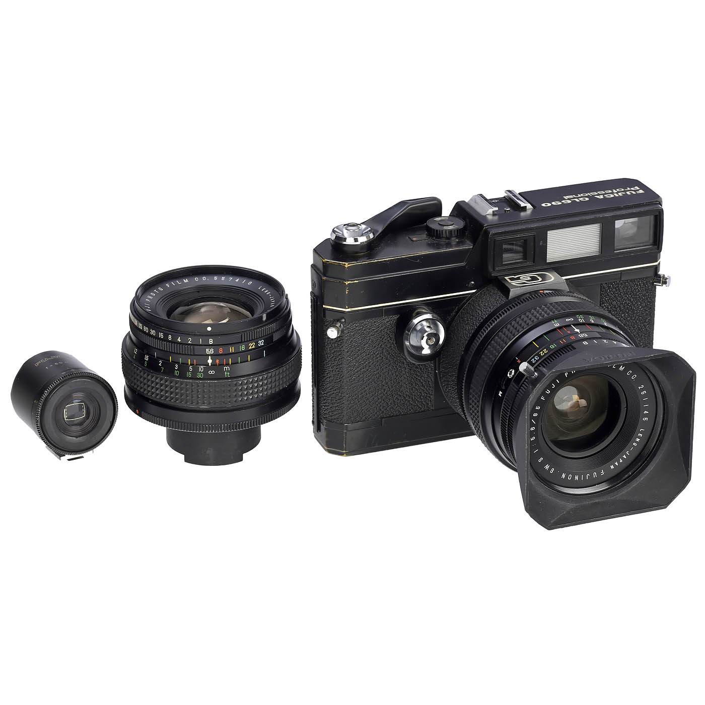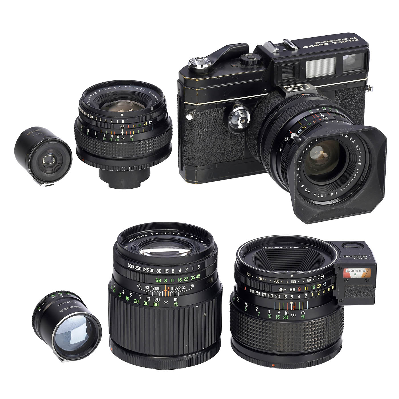 Fuji Photo, Japan. 1) Fujica GL 690 Professional, 6 x 9 cm, rangefinder camera for interchangeable lenses, with Fujinon SW S 5.6/65 mm lens and hood, rangefinder accurate, auxiliary shutter working (only with 120 film inserted), optics clean under point light. (3/3) - 2) Fujinon 5.6/180 mm, with 180mm viewfinder, optics clean under point light. (2-/3) - 3) EBC Fujinon AE 3.5/100 mm, optics clean under point light, exposure meter and shutter working. (2-/2-) - And: 4) Fujinon SW S 5.6/50 mm, with heavily worn 50mm viewfinder, rear element with slight fog under point light. (3-4/3-4)