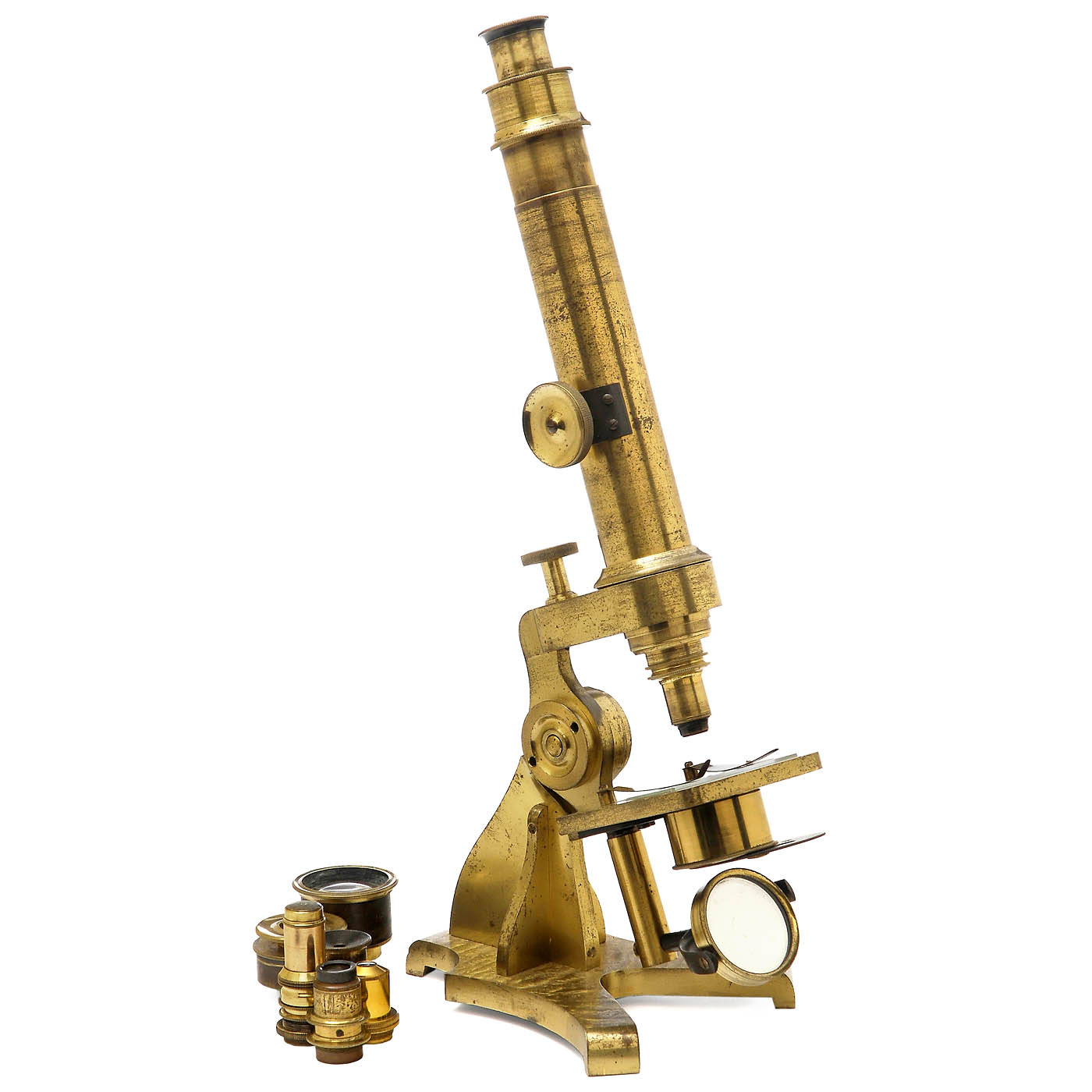Unmarked, original lacquered brass, chiselled foot and stage, English base on wood plate, tilting stand, substage disc of revolving diaphragms, concave mirror, rack-and-pinion coarse adjustment, 2 oculars, 4 objectives, with live box, box with preparations and prism, in fitted mahogany case, instrument height 15 in.
