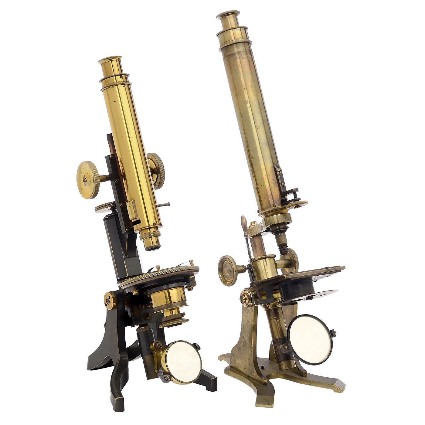 1) Unmarked, c. 1845, claw-footed base, tilting stand, single mirror attached on slide to the tubular limb, stage with a revolving disc of diaphragms and lever mechanical stage, double milled-head pinion and triangular bar with rack at the back for the coarse adjustment, fine adjustment with a short lever at the front of the tube, 9 in. long body tube, 1 ocular, 1 objective, overall height 16 ½ in. (3-4/3-4). - And: 2) Engraved: "J. Swift & Son, London", c. 1890, original lacquered brass, coarse and fine focusing, rotating stage, double mirror, swiveling condenser with prism, eyepiece, objective lens, tube aperture for the prism, closed height 14 ½ in. (2-3/2-3)
