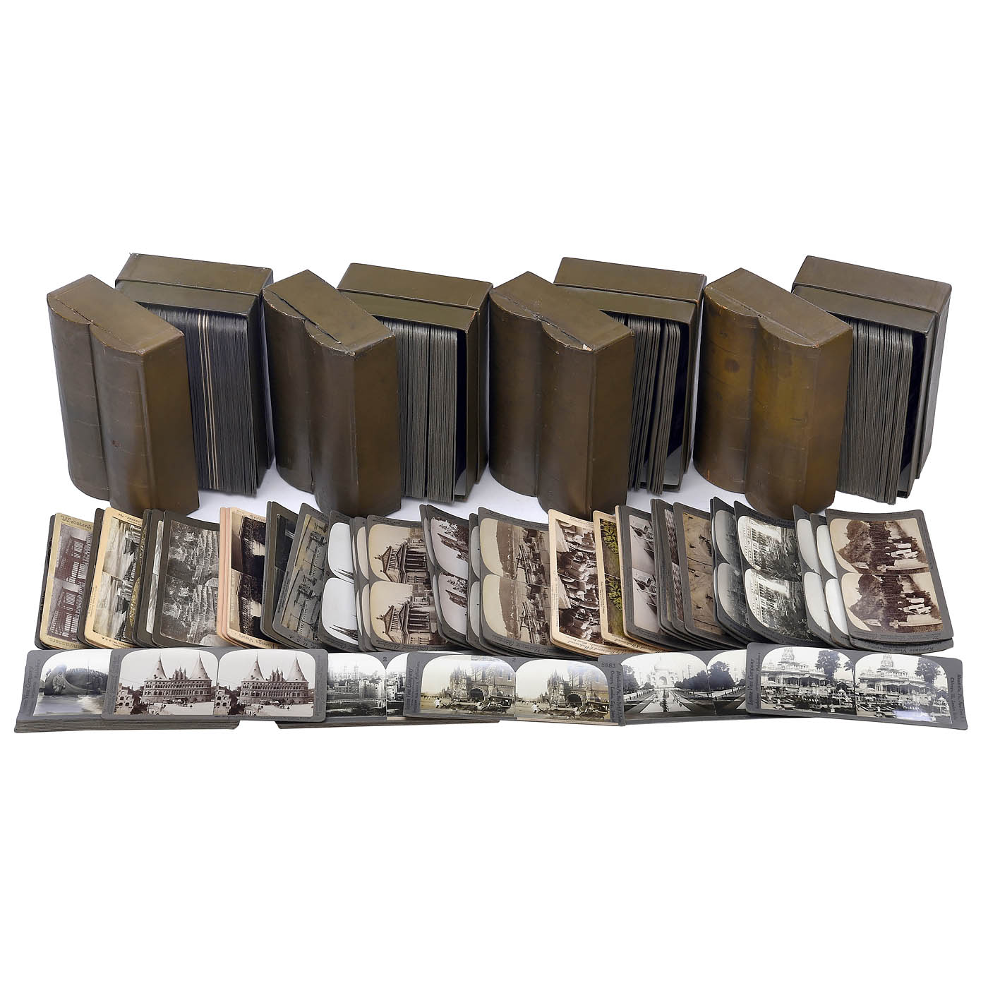 A total of approx. 337 stereo cards, 9 x 18 cm, by Keystone/Underwood in 4 unmarked boxes, image tone good on almost all cards. 1) Keystone, 155 cards, all with original German text in Fraktur print on the front, very rare. Of these, 22 are cards from the German Empire, others are from across the world, especially from the colonies. - 2) Keystone, numbered 2-95, 48 cards in wrapper with imprint in Fraktur, from across the world (including 4 of the German Empire). - 3) Underwood, numbered 1-100, all German Empire, reverse with English long text and six-language short text, some cards with six-language short text only, and 6 cards (3, 7, 57, 58, 87, and 85) with a blank back. - And: 4) Underwood and others, 34 cards of the German Empire, front with English imprint. - Note: This selection of images from before 1914 shows different subjects chosen from a European perspective unusual for this publisher and country of origin.