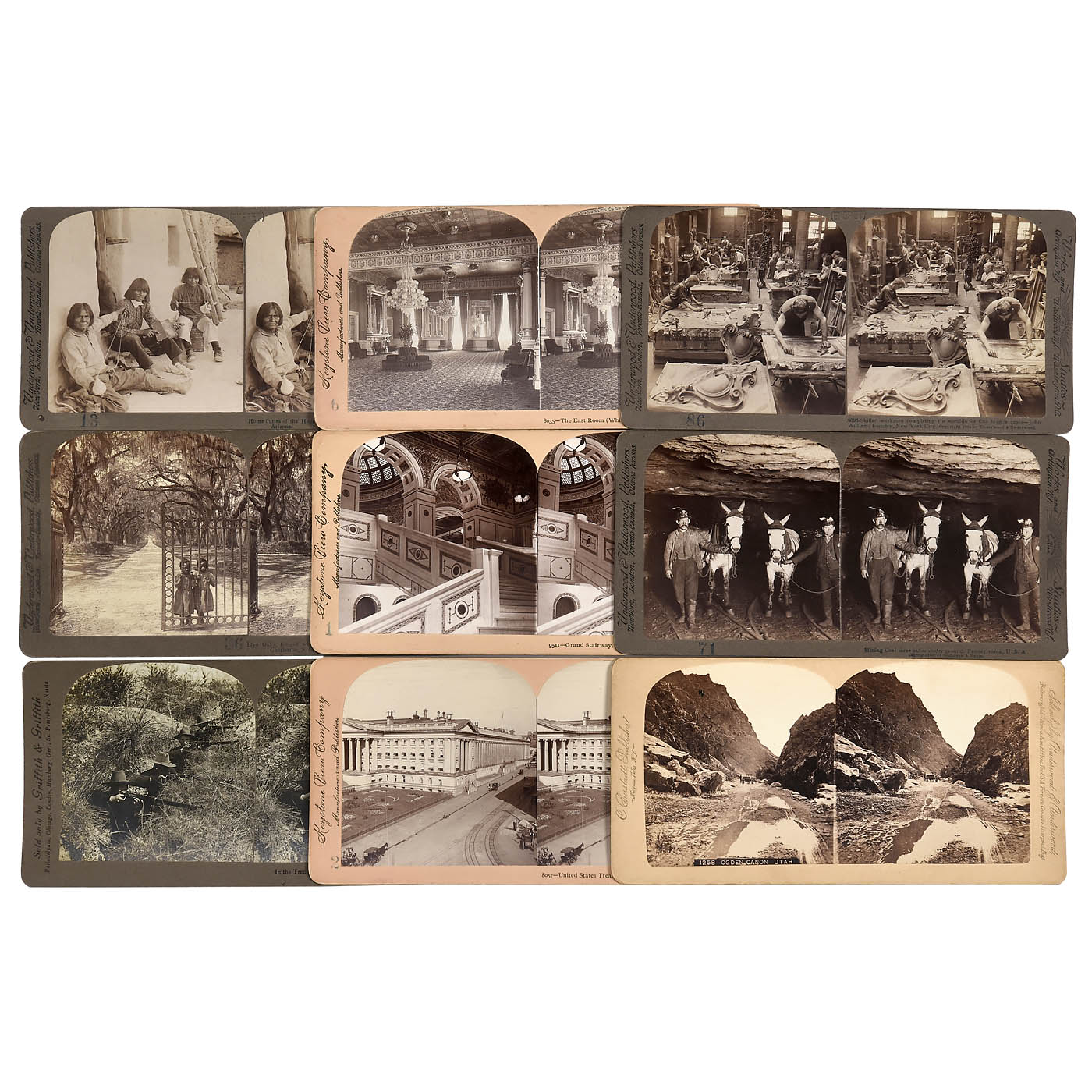 American stereo cards by Griffith, Jarvis, Keystone, Kilburn, Strohmeyer, Underwood and White, good to very good condition. 1-3) School Room Travel Vol. I, II and III, small boxes for approx. 50 cards each: Vol. I with 5 stereo exercise cards, 22 "Third-Dimension Eye-Training Series" cards and 12 of animals, including elephants; Vol. II with 44 cards of England, Ireland and Canada and Vol. III with 47 cards America, Yosemite Valley, Mexico, Cuba, Australia and New Zealand. - 4-5) School Room Travel Vol. I and III, large boxes for approx. 100 cards each: Vol. I with 88 cards of Europe and Vol. III with 92 cards of America. - 6) Underwood book-form box "Scotland through the Stereoscope" Vol. I, II, III, but containing 75 stereo cards from Asia only, including 31 of Japan, 10 of Ceylon, 16 of India, 8 of China and 2 of Korea. - And: 7) 46 cards, including 20 of Italy, 13 of Egypt and 11 of Greece.