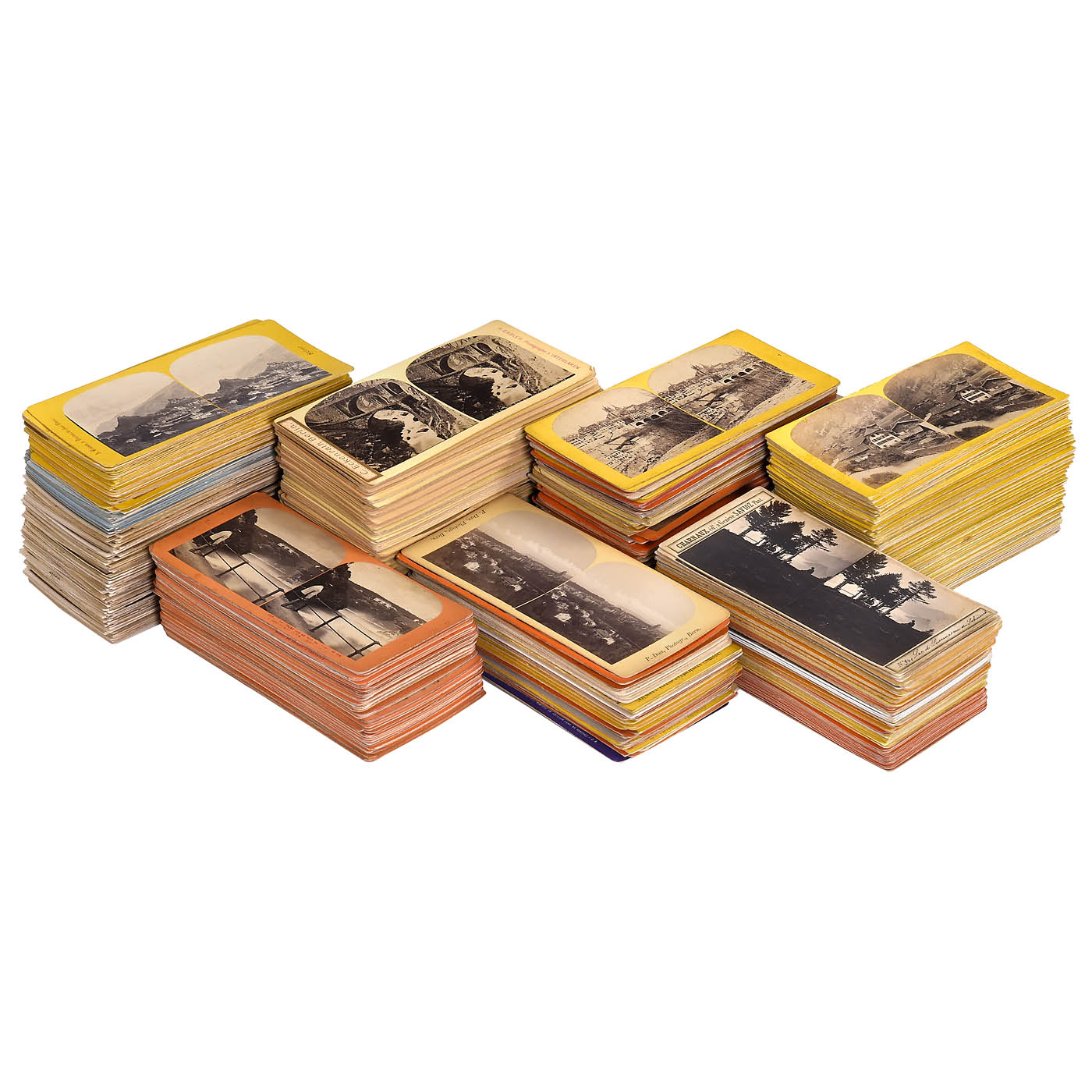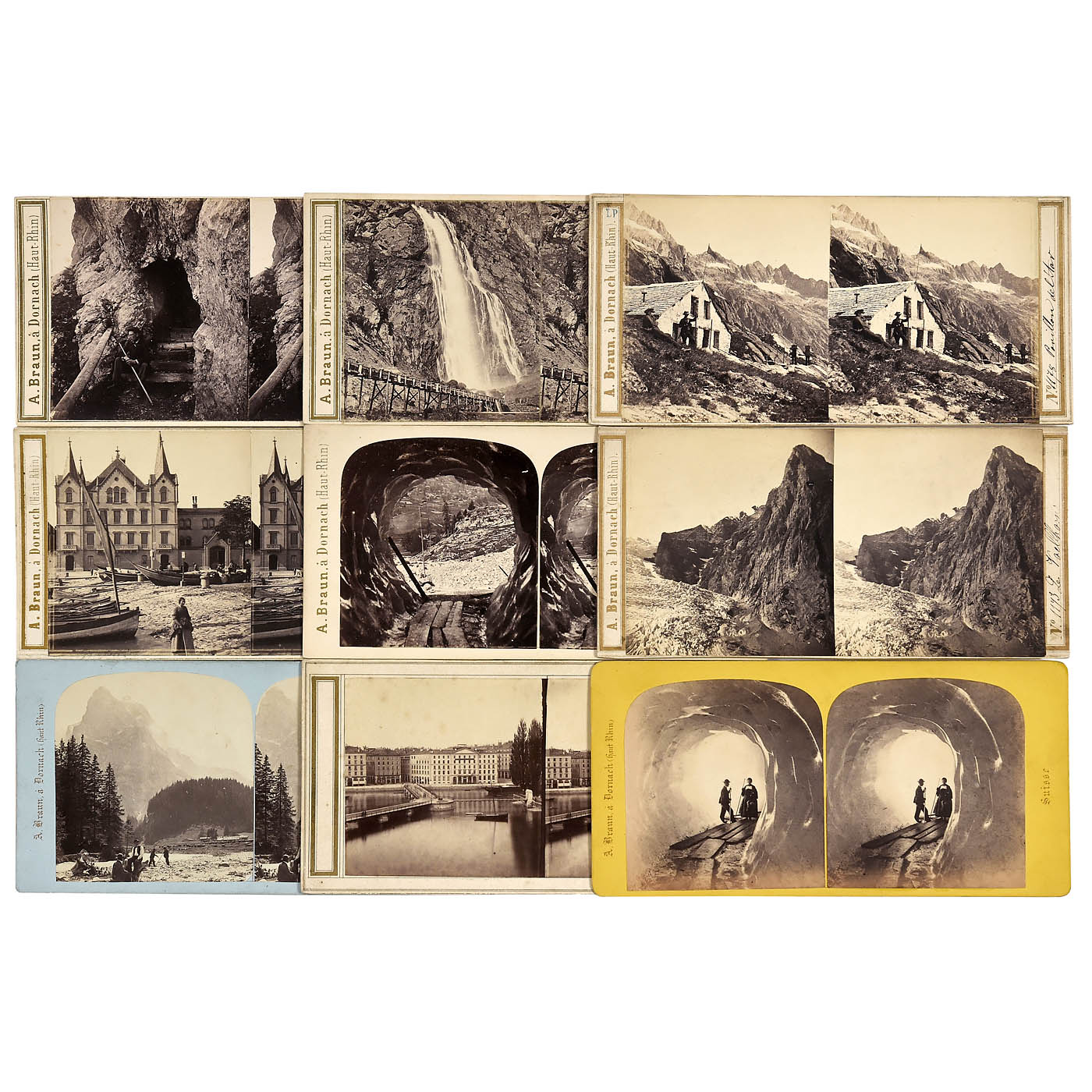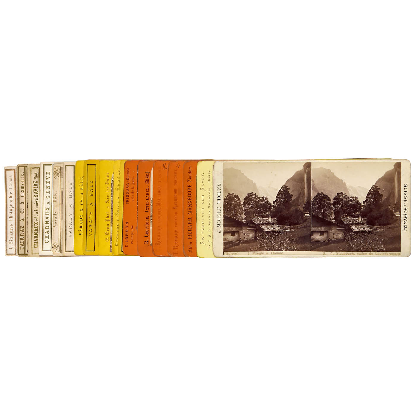 9 x 18 cm, mostly in normal to good condition, the majority (550) named, including Swiss photographers such as Biétrix, Braun, Bruder, Brun, Charnaux, Does, Fetzer, Flury, Gabler, Jullien, Koch, Krenn, Leuthold, Lorson, Messaz, Moegle, Randegger, Reymann & Pricam, Richard, Rossier, Schrader, Tairraz, Varady and Yollenweider. - Note: The different versions of Braun, Gabler and Varady are historically informative. In this collection are also 90 cards by William England of London, one of the most atmospheric photographers of the period.