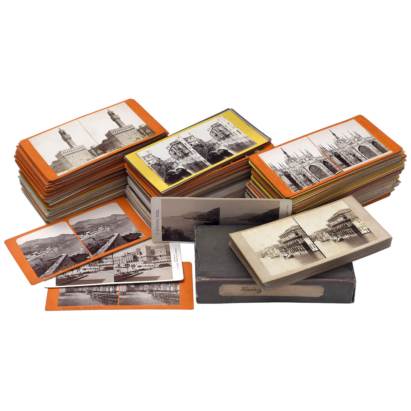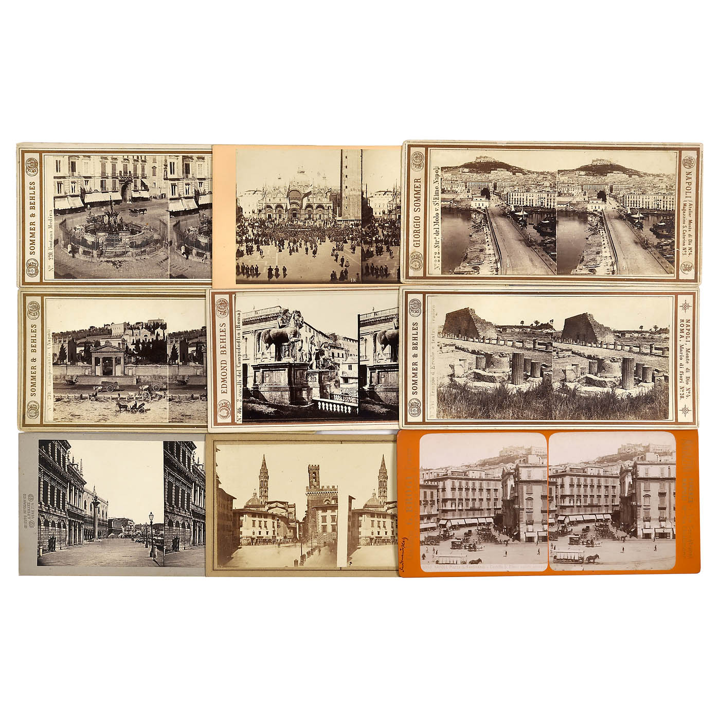 9 x 18 cm, mostly in normal to good condition, comprising approx. 230 by Italian photographers, the majority named: Alinari, Behles, Bernoud, Brogi, Felici, Mauri, Naya, Perini, Ponti, Rive, Siani, Silbermann, Sommer, Sommer & Behles, van Lint and Verzaschi, as well as other foreign photographers, and a box of 32 early unnamed Venetian views. - In addition: 14 stereo cards of Monaco and Menton (all with reverse print and medals by Beer, Klagenfurt, stamped with Eckenrath on the front) and San Remo.