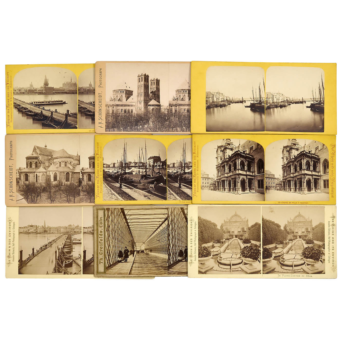 44 early stereo cards, 9 x 18 cm, of Cologne and its surroundings, churches, bridges, the mediaeval town hall, the botanical garden and the cathedral under construction, by Gebrüder Schönscheid Cöln Breitestraße No. 14 (later Domhof 13), Th. Creifelds, Anselm Schmitz Hof-Photograph and W. England, normal to good condition, some cards with age spots. - In addition: Box of 50 English stereo slide aerial photographs, 9 x 14 cm, a technically correct reduction (without loss of detail) of the large-format reconnaissance flights from 1942-45, all with flight number and date, including 7 photographs of Cologne and the cities of the Ruhr area as well as Dresden and Hamburg.