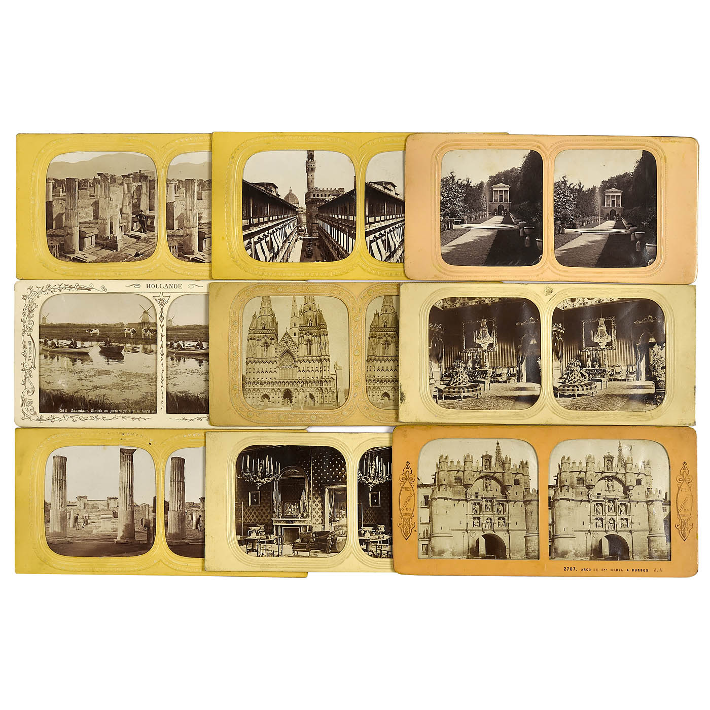 France. Approximately 270 tissue views, 9 x 18 cm, hand-tinted and perforated for back-lit illumination effects, the majority in normal condition, some with small inconspicuous tears or creases, more than half with assorted embossed fronts, shell (or cymation-) shaped frame and handwritten text on the back. All motifs from landscapes or cities. 1) 156 views of France (plus a normal card with the same motif). - 2) 83 views of Italy. - And: 3) 8 of Spain, 7 of England, 4 of the Netherlands, 3 of America, 2 of Algeria, 2 of Monaco, 2 of Turkey and 1 of Malta, Palestine and Russia.