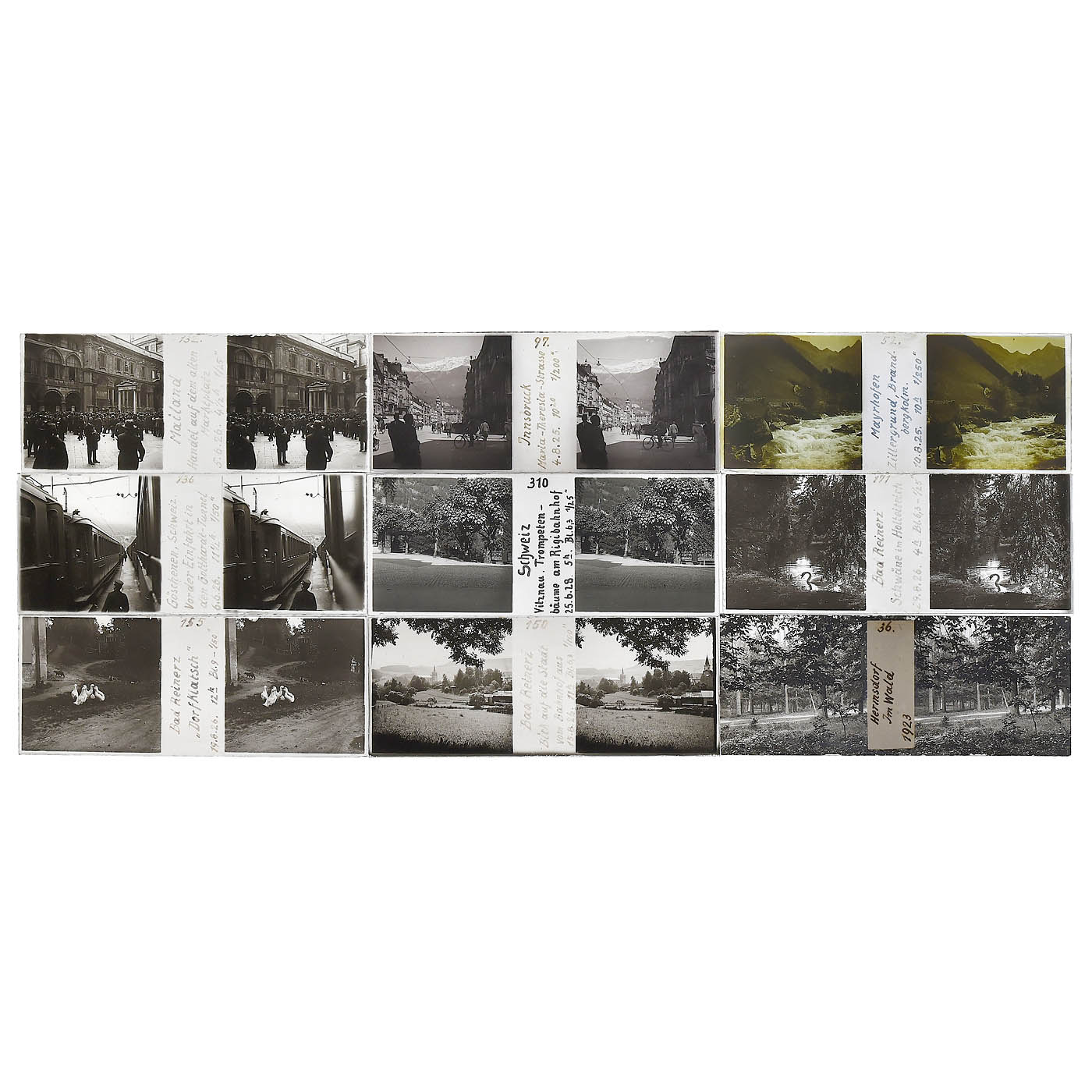 1) Approx. 170 Kodachrome slides from 1939-49, the majortiy 1940-41, in three lantern slide boxes, good colors. - 2) Box with approx. 80 Agfacolor stereo slides from 1 July 1939 to 1963, Leica format 24 x 36 cm, framed 45 x 107 mm, with captions, including the photographer with his camera, early pale palette. - 3) Box with approx. 100 color stereo slides, 6 x 13 cm, 1950-70, framed, mostly alpine motifs. - 4) Approx. 140 monochrome stereo slides, 45 x 107 mm, all with date, location and technical information, mostly alpine regions. - Note: Some experiments were carried out with multi-colored, intensive toning to achieve atmospheric color similarities. - 5) 4 color stereo postcards by Knackstedt & Näther. - 6) Chromoplast picture Series 47, Hamburg 295-300 and 16 others. - And: 7) 14 colored stereo cards, 9 x 18 cm, genre scenes. - Good exhibition material on the history of color photography.