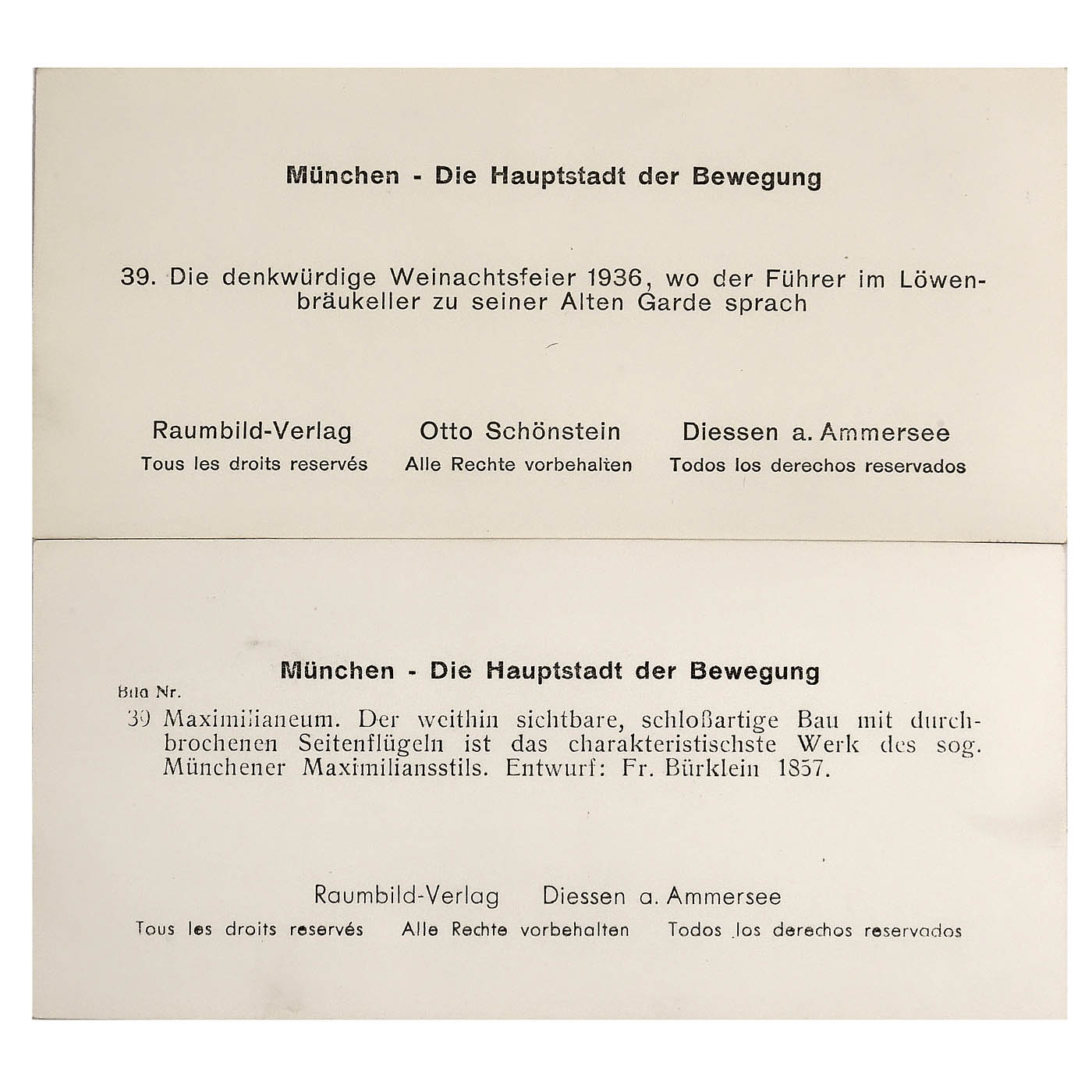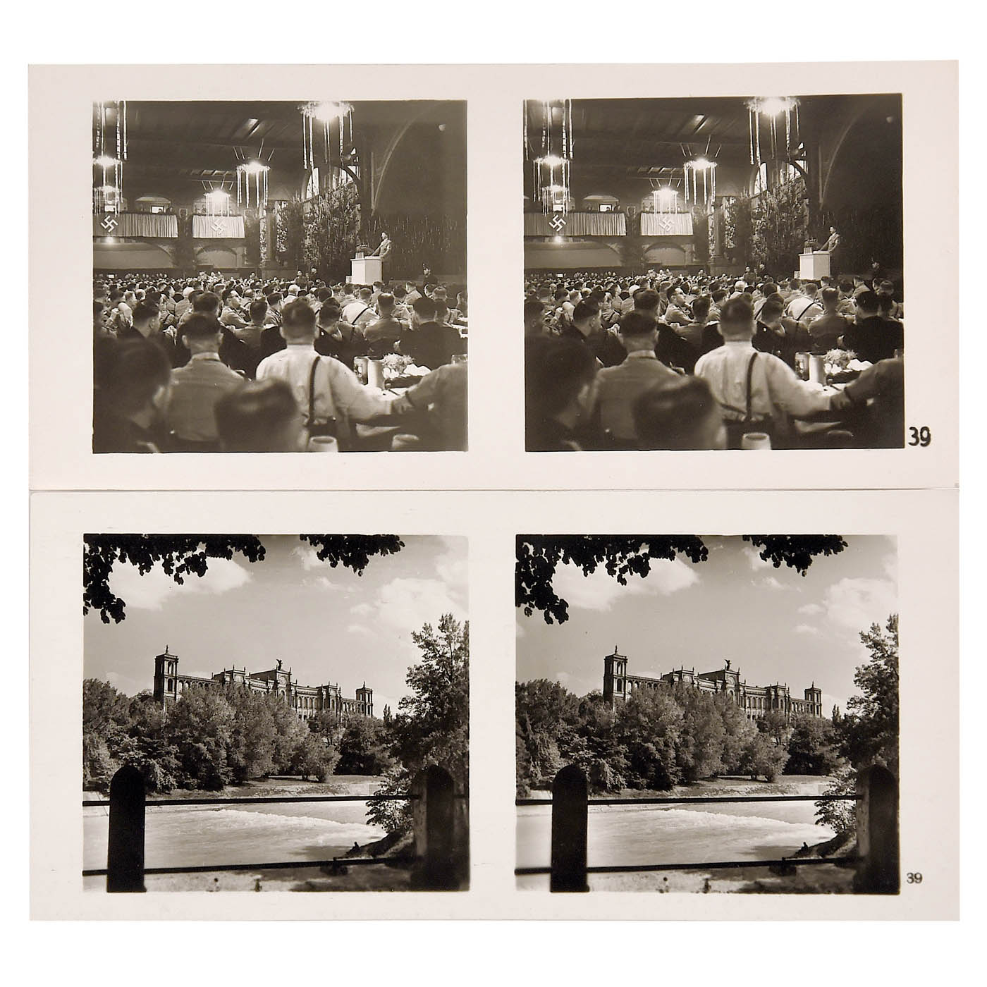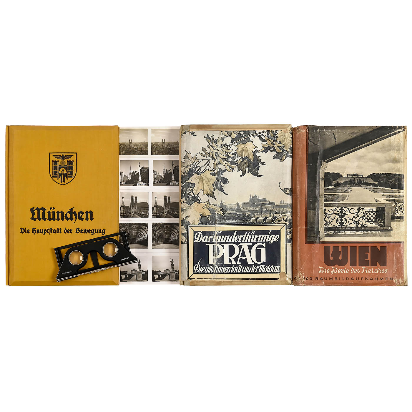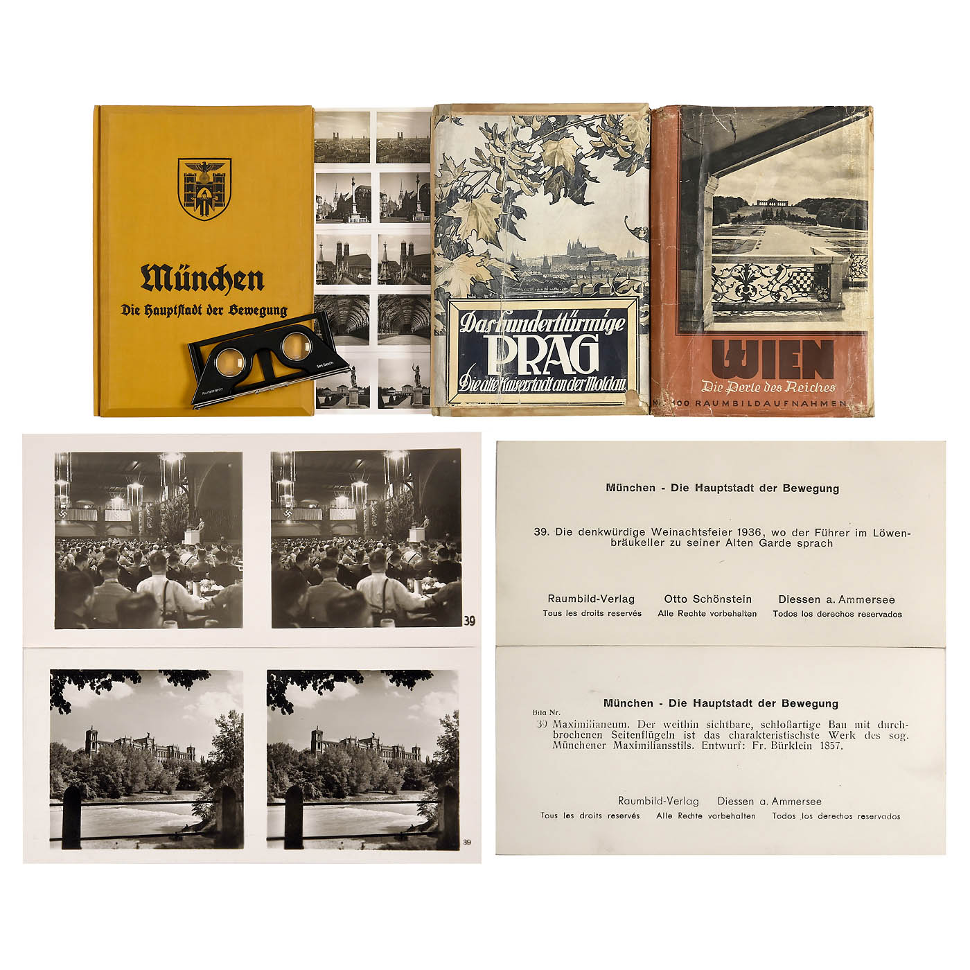 Raumbild-Verlag Otto Schönstein, Diessen and Munich. All albums with complete set of images and stereo viewers. 1) "Munich - The Capital of the Movement", 1937, text by Oscar Robert Achenbach and Hans Thoma, with 101 stereo cards by Heinrich Hoffmann, including two versions of card No. 39: "Maximilianeum" and "Löwenbräukeller" (with speaker), embossed linen covers, 60 pages, with inspection sheet, instructions, advertising postcard, very well preserved. (2-/2-) - 2) "Vienna - The Pearl of the Empire", 1941, text by Ernst Holzmann, with 100 stereo cards, 128 pages, embossed linen binding (torn and faded). (3-/3) - And: 3) "The Hundred-towered Prague", 1943, text by Dr. Hans Felix Zimmermann, with 100 stereo cards by Hermann Schoepf, 116 pages, linen binding, instructions, cover torn and repaired. (3-/3) - National emblems pixelated.