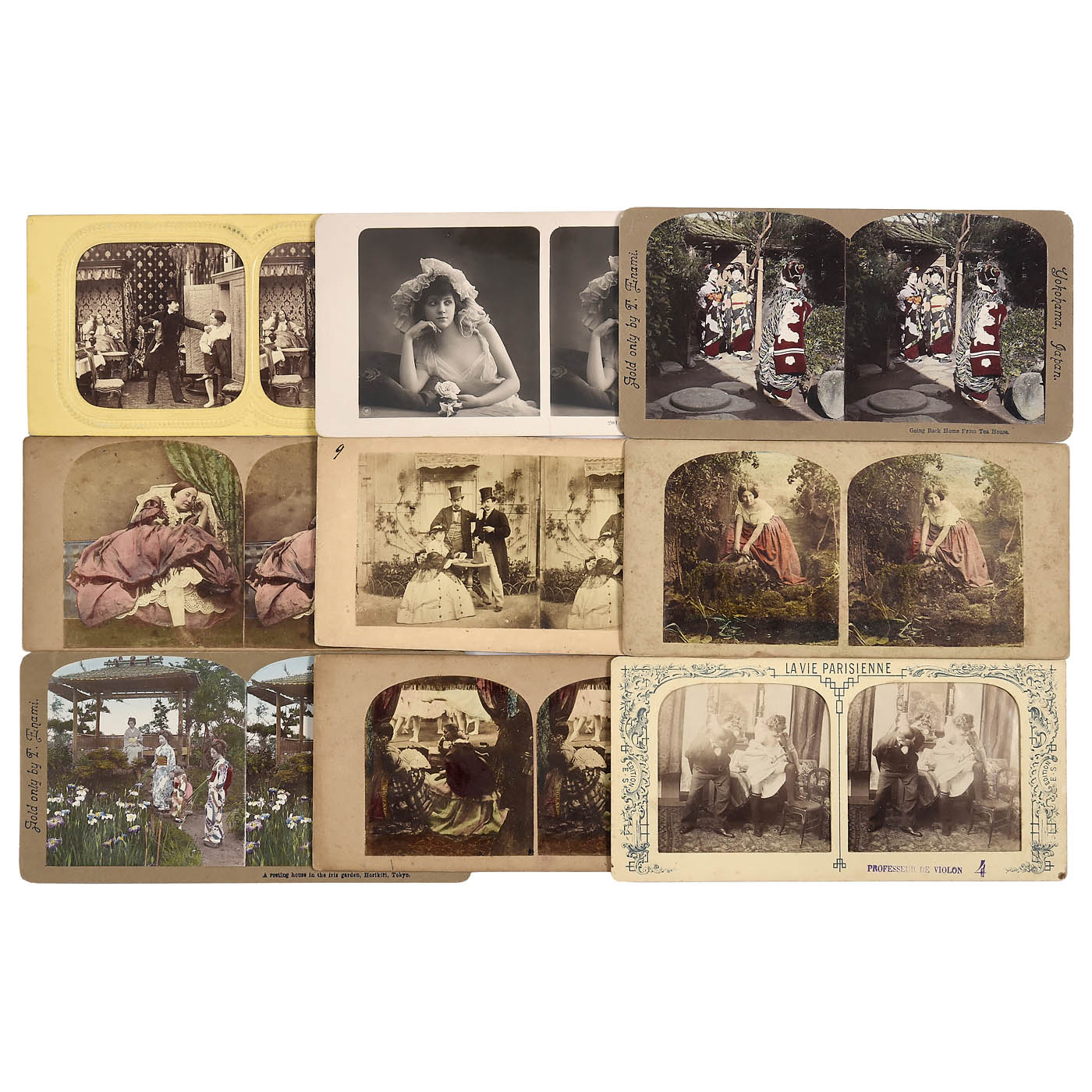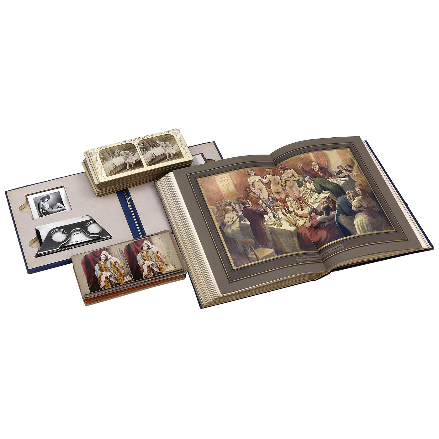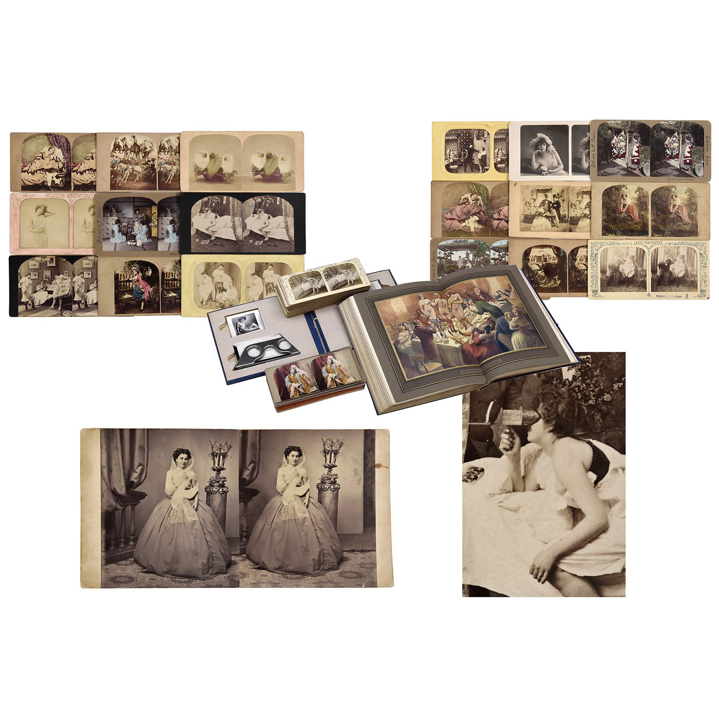 9 x 18 cm, mixed condition. 1) Pre-1860 card of a young lady in evening dress "topless", reminiscent of the court around Empress Eugenie, extremely rare. - 2) 22 tissues cards, including "Actrices Parisiennes," "Nos Mondaines", "La Vie Parisienne" and others. - 3) 31 cards, two of a stereo viewer, 17 colored, 9 depicting sculptures. - 4) Kind and Moreck, "Gefilde der Lust", Verlag für Kulturforschung Wien & Leipzig 1930, 351 pages, with the 16 plastic-morphological picture plates in anaglyph print. - And: 5) 8 stereo cards from Raumbild-Bücherei, blue volume with stereo viewer and Martins Kunstmappe Serie I, 6 x 13 stamped on the back with "Raumbild-Verlag Schönstein", Serie II with 8 cards, plus 13 cards stamped as "raw copies" and 6 additional motifs.