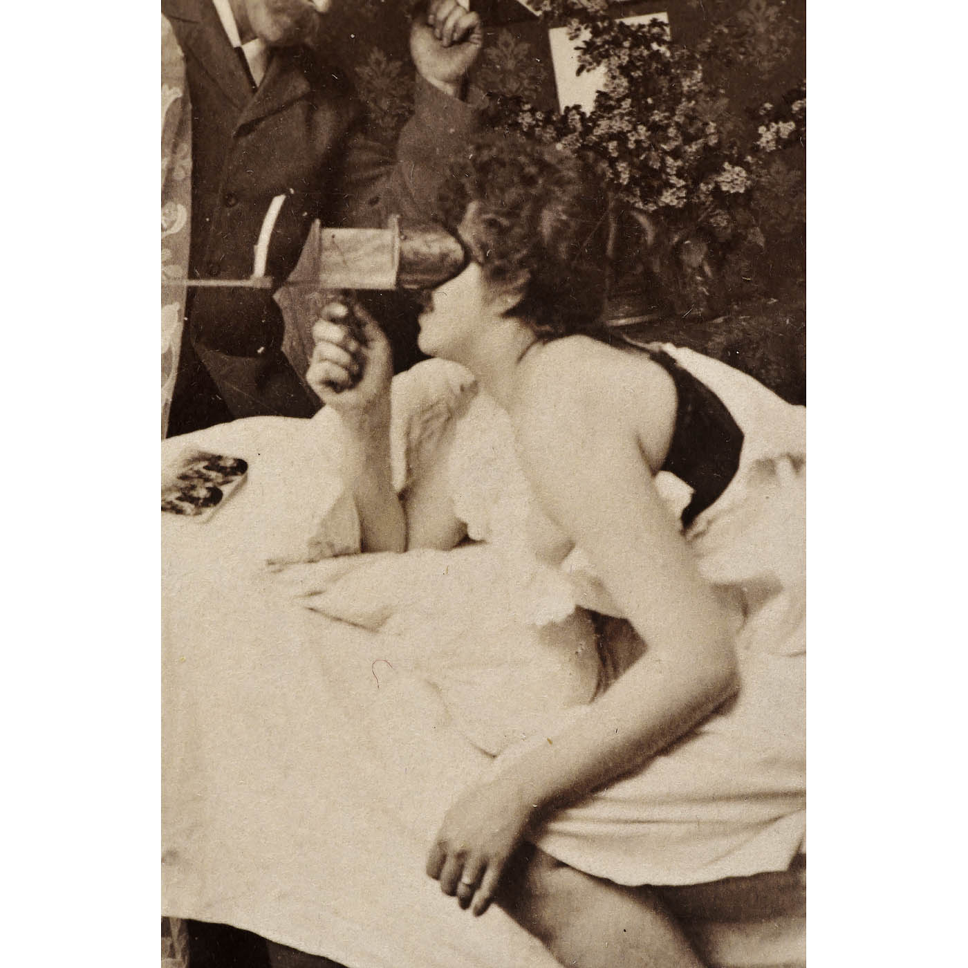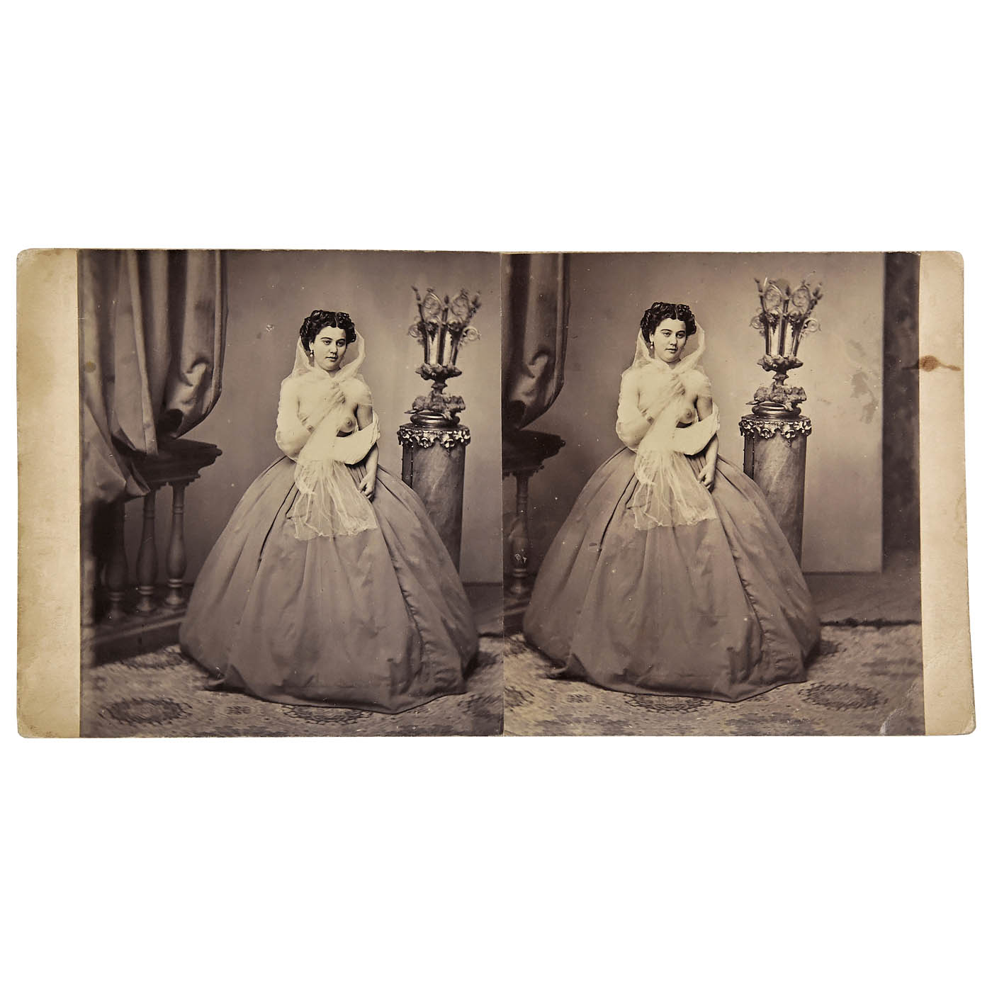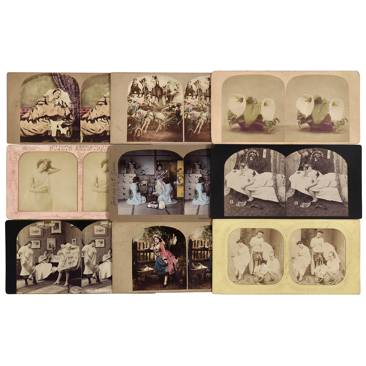 9 x 18 cm, mixed condition. 1) Pre-1860 card of a young lady in evening dress "topless", reminiscent of the court around Empress Eugenie, extremely rare. - 2) 22 tissues cards, including "Actrices Parisiennes," "Nos Mondaines", "La Vie Parisienne" and others. - 3) 31 cards, two of a stereo viewer, 17 colored, 9 depicting sculptures. - 4) Kind and Moreck, "Gefilde der Lust", Verlag für Kulturforschung Wien & Leipzig 1930, 351 pages, with the 16 plastic-morphological picture plates in anaglyph print. - And: 5) 8 stereo cards from Raumbild-Bücherei, blue volume with stereo viewer and Martins Kunstmappe Serie I, 6 x 13 stamped on the back with "Raumbild-Verlag Schönstein", Serie II with 8 cards, plus 13 cards stamped as "raw copies" and 6 additional motifs.