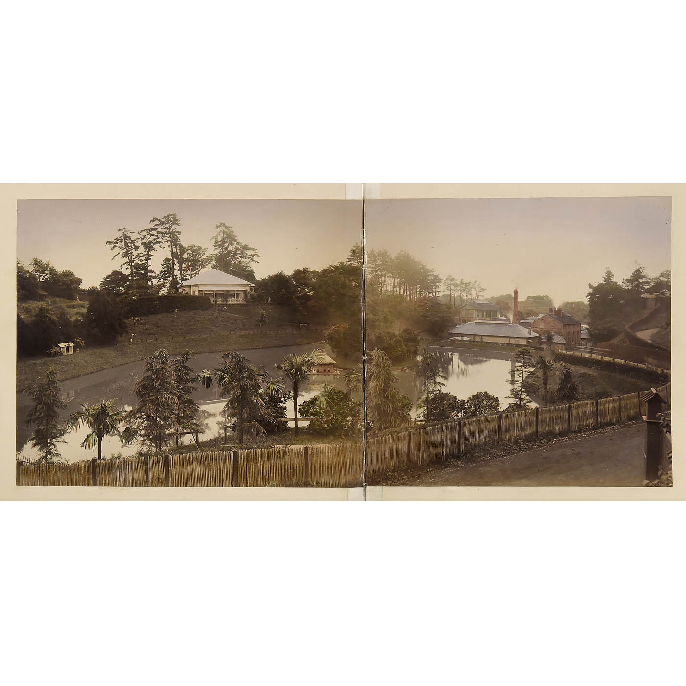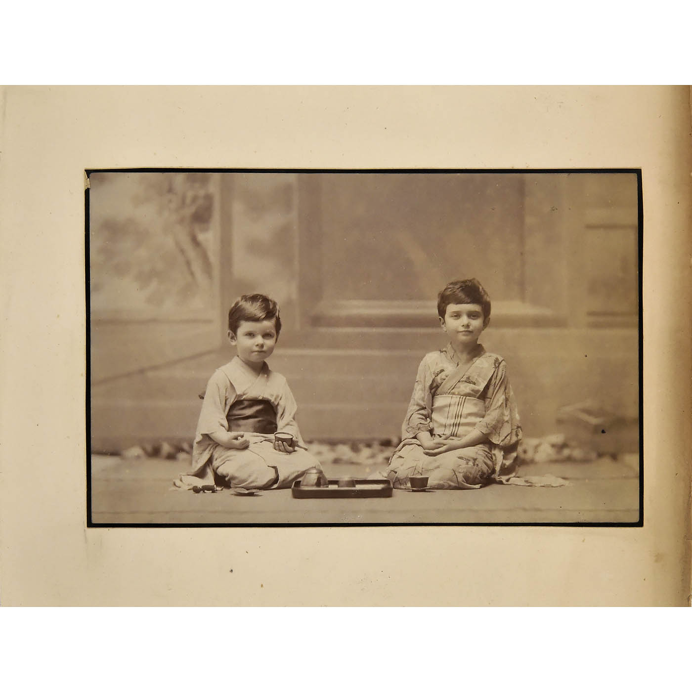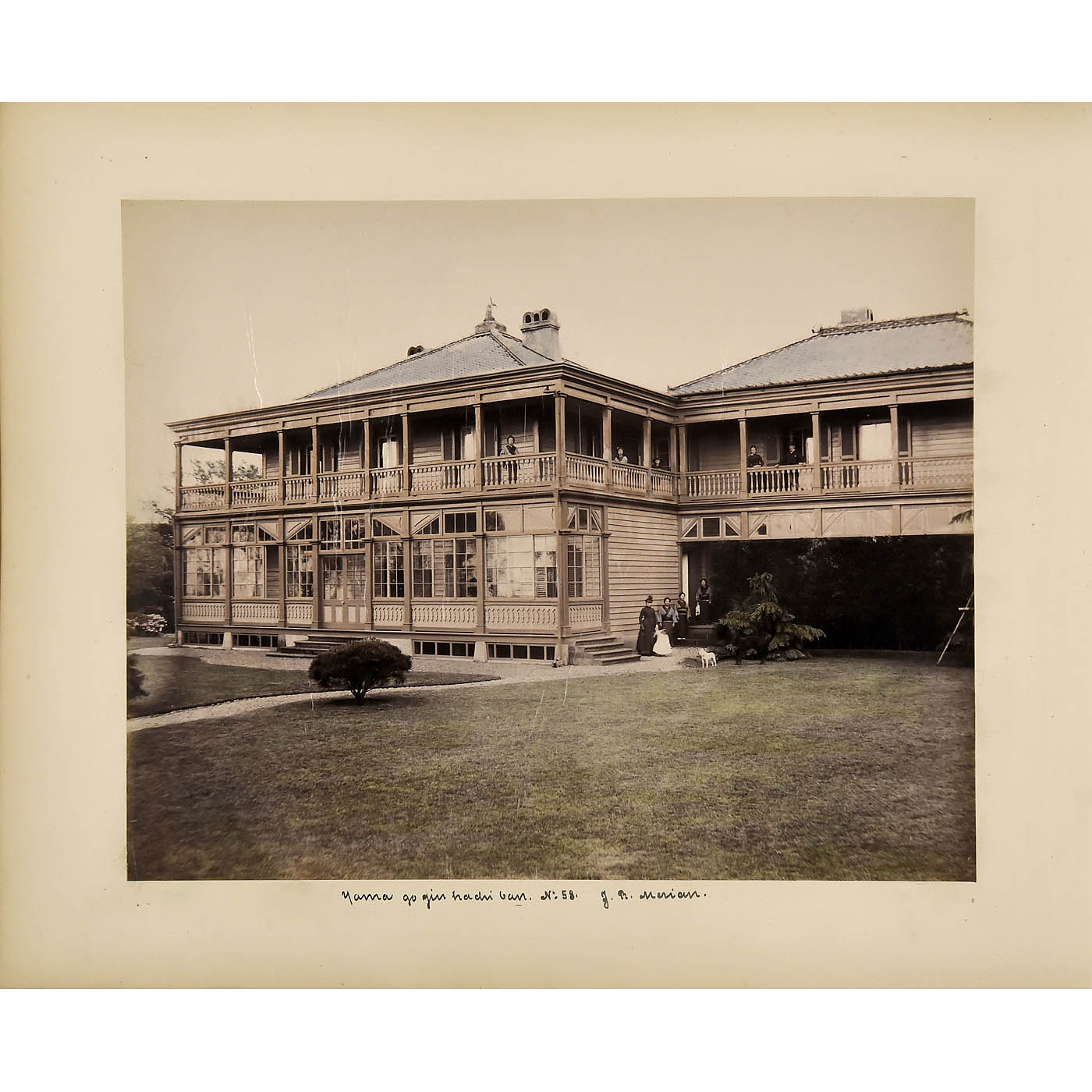 Fabric-covered album, 40 x 32 cm, with 50 plates filled with approximately 300 photographs, some with text in German, a few in English, several tinted, one by the photographer Farsari, covers heavily worn but images well-preserved. - Note: The images provide a rare glimpse into expatriot life in Japan during the Meji period, the self-confidence of the population and the subtle humour of the guests. Depicted are prominent figures from the circle of industrial businessmen, including Everhard Groesser (in Japan since 1864), Kellmann, Wismer, Fritz Abegg with servant Netto and dog Stupp, the raw silk merchants Nabholz & Ossenbrugger, Johann Rudolf Merian and his wife, as well as visits to locations around Yokohama, a brewery (presumably the Japan Brewery Co.), celebrations in Mianoshita, the S.M.S. Bismarck, S.M.S. Carola and S.M. cruiser frigate Leipzig. There is also a selection of cultural scenes, including Japanese wives, children and two European boys wearing kimonos at a tea ceremony. An extremely rare historical document.