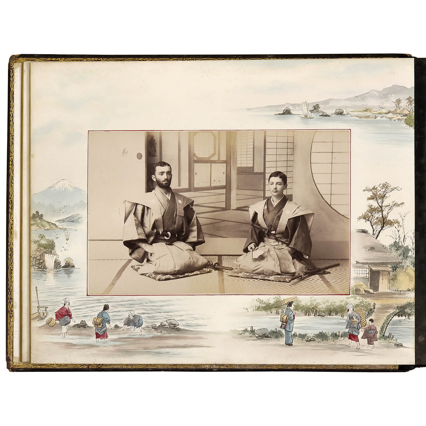 1) Silk-covered album, 24 x 30 cm, with 16 panels for cartes-de-visite, with dedication in Kanji "We present this to Dr. Riess as a memorial July 1902 - Japanese friends and students", see Wikipedia in English, Japanese and German to Ludwig Riess 1821-1928, he was professor at the university of Tokyo 1887-1902 for history. The album is complete with 128 cards, all Japanese with Europeanized names, some with pencil notes of the profession and status of the subjects, several with autographs. A document of the intellectual elite of Japan. Album in new like condition, only the clasp is missing. (2/2) - 2) Album, 35 x 27 cm, wood covers with raised lacquered motif of Fujiyama, 9 hand-painted panels for varying formats, containing 2 cabinet cards from 1898 of the ambassador Kiyoura (?) and his wife in Tokyo, 2 cartes-de-visite from Berlin 1891 with handwritten greetings in Kanji, edge of cover dented, otherwise in good condition. (3/3) - 3) Deluxe album, 36 x 28 cm, with fine artistic lacquer motif of a ship on the high seas, containing 11 hand-painted panels with 45 photographs of Americans: "Presented to George Whitfield by his yachting friends in Japan 1890", edge of the cover dented. (3/3) - 4) Empty album, 35 x 27 cm, with loose covers, a carved bird scene on the front, with 9 hand-painted panels for postcard formats. (3-/-) - And: 5) Empty album, 35 x 27 cm, wood cover with lacquer work and inlay, 9 hand-painted panels for different formats, losses to lacquer work, cover loose. (4/4)