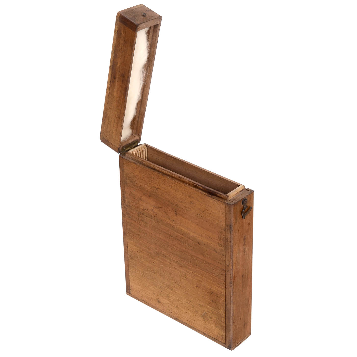 Light-tight walnut box with fitted sections for six thin plates or daguerreotype plates with a maximum thickness of 1.1 mm, maximum plate size 109.9 x 168 mm, minimum required plate width (so that the plates do not fall out of the groove) 105.5 mm, external dimensions 17.8 x 2.9 x 13 cm. - Note: Suitable for the Parisian "half-plate" of 6 x 4 in. (108 x 162 mm) or the English "double-quarter" of 6 ½ x 4 ¼ in. (10.7 x 16.5 cm). Very rare accessory from the early days of photography.