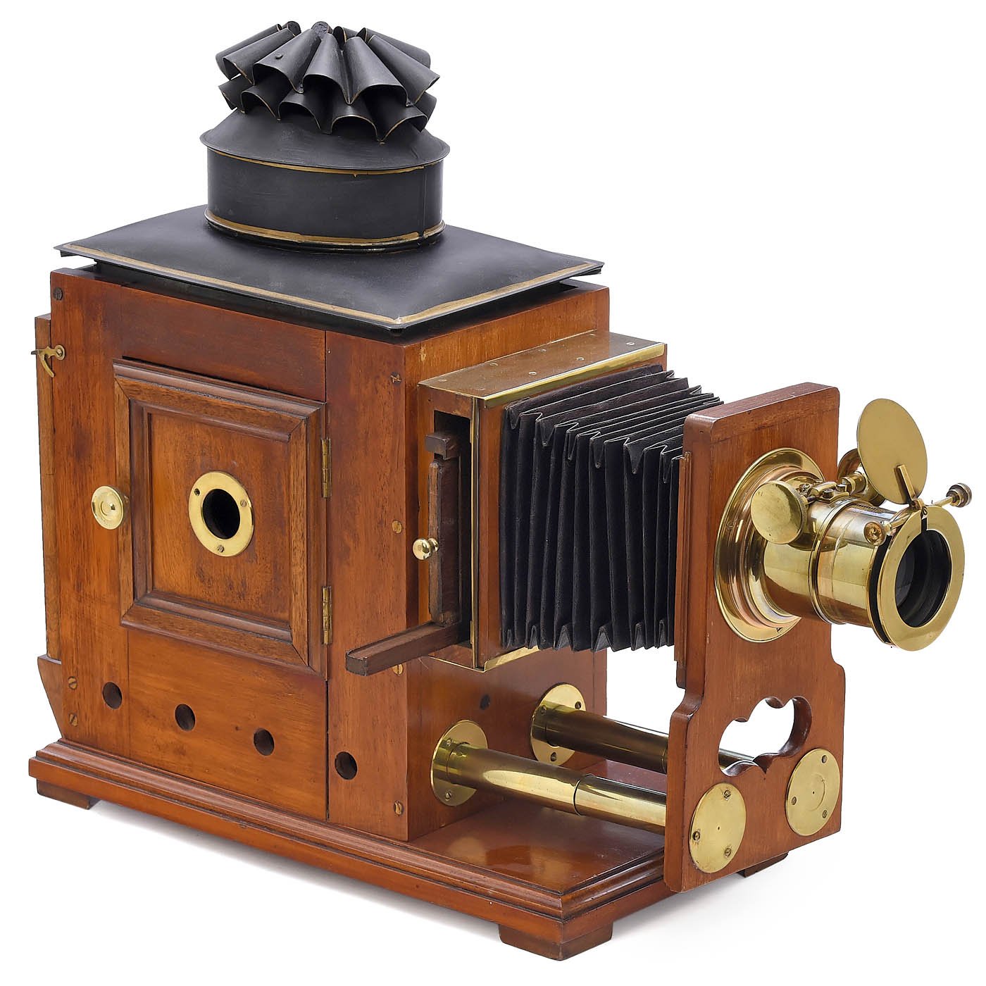 U.W. Londonmade, England. Attractive mahogany magic lantern with brass fittings for approx. 11 cm lantern slides, with holder for slides of 8.5 x 8.5 cm, brass Petzval-type 10 ½ in. lens, condenser, original electrified lamp-holder with modern cable and English plug, rear element immobile, front extension up to 30 cm, height with chimney 18 ½ in., good condition.