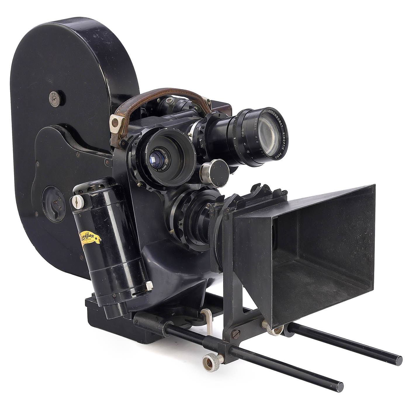 Eclair, Paris. 35mm film in 120-meter quick-change cassette, with electric motor, electrical functions not tested, sheet-metal compendium with filter carrier and sought-after lenses in quick-change carrier: Kinoptik Apochromat 2/40 mm no. 24495 and Kinoptik Apochromat 2/75 mm no. 27230, focus and aperture working, both lenses with interior film when viewed under point light, front elements free of cleaning marks. - In addition: Kinoptik Apochromat 2/100, iris diaphragm missing, focus stuck, scratches on front element.