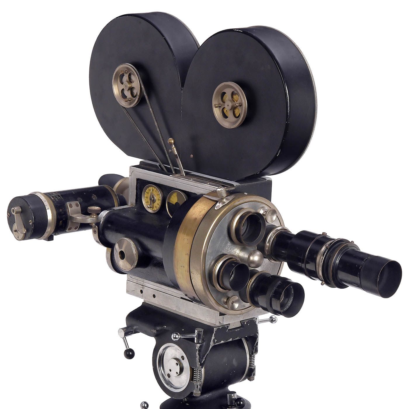 Cinephon-Werke Josef Slechta, Prague. For 120-meter film reels in attachable cassettes, with hand-turned or electric double-claw movement, case-mounted viewfinder via ground-glass screen with telescope magnifier, four lenses in revolver quick-change head: Carl Zeiss Jena Tessar 3.5/35 mm, Sonnar 2/40 mm, Astro Kino-Portrait 2.3/75 mm and Astro 5/200 mm, decorative Bell & Howell cassette for 300 meter film with adapter for Cinephon Slechta camera and Sachtler & Wolf tripod with hydro head and wood legs, missing crank, electrical functions untested. - Note: When the camera is stationary, the ground-glass screen can be swiveled in instead of the film.