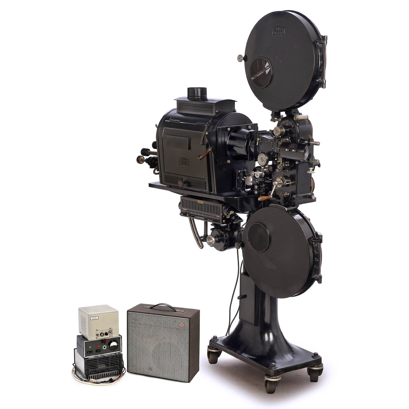 Zeiss Ikon, Dresden. Film projector for 35mm silent and sound films, Maltese cross mechanism, protected front diaphragm, two fire-protection drums for 600m spools. Drive: hand crank or via the adjustable original Zeiss Ikon motor. Zeiss Ikon lamp housing with the original carbon arc lamp. Everything mounted on cast-steel table. Complemented by a Zeiss Ikon light sound scanner. Projection lens: Super-Kiptar 2/70 mm. Accessories: loudspeaker, amplifier and all necessary parts for sound film projection. - Please note: Electrical parts should always be checked by a qualified electrician before use! - Special feature of this unique offer: This rare Ernemann III cinema projector was equipped with special accessories such as a low-voltage halogen lamp and transformer, rectifier, amplifier and loudspeaker for demonstration purposes (function of the historical sound film technology) without changing the technical components and can be used immediately for the projection of optical sound copies (a roll is included) and can be connected to any normal 230-volt socket. The function can be demonstrated on request during the preview. Never offered in this functionality at one of our auctions before.