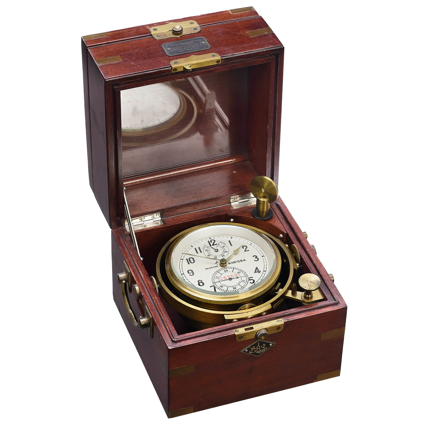 First Moscow Clock Factory Kirova. No. 26269, with fusee movement, second hand for 1/2 seconds, power reserve indicator for 56 hours, two-part mahogany wood case with glass pane and gimbaled brass mount, working, with key. This clock was modeled on the Lange standard chronometer by Glashütte.