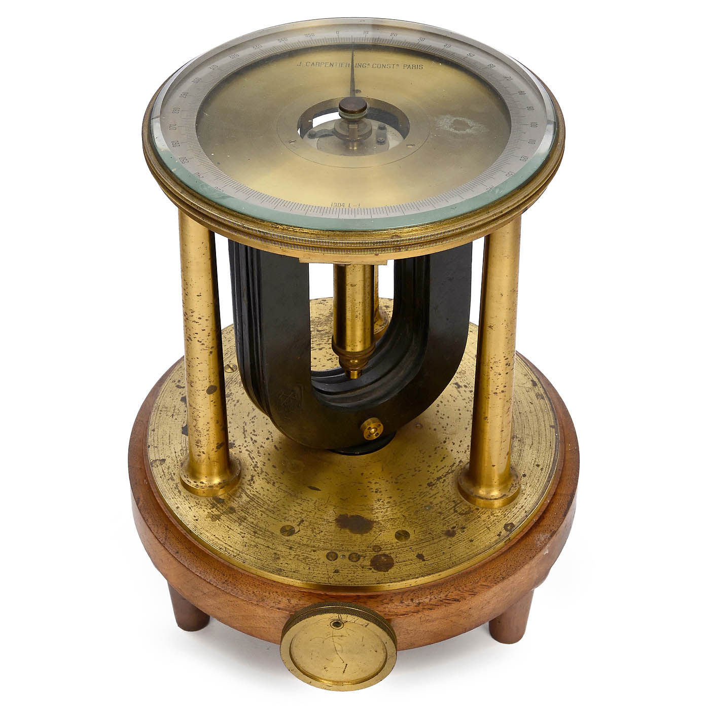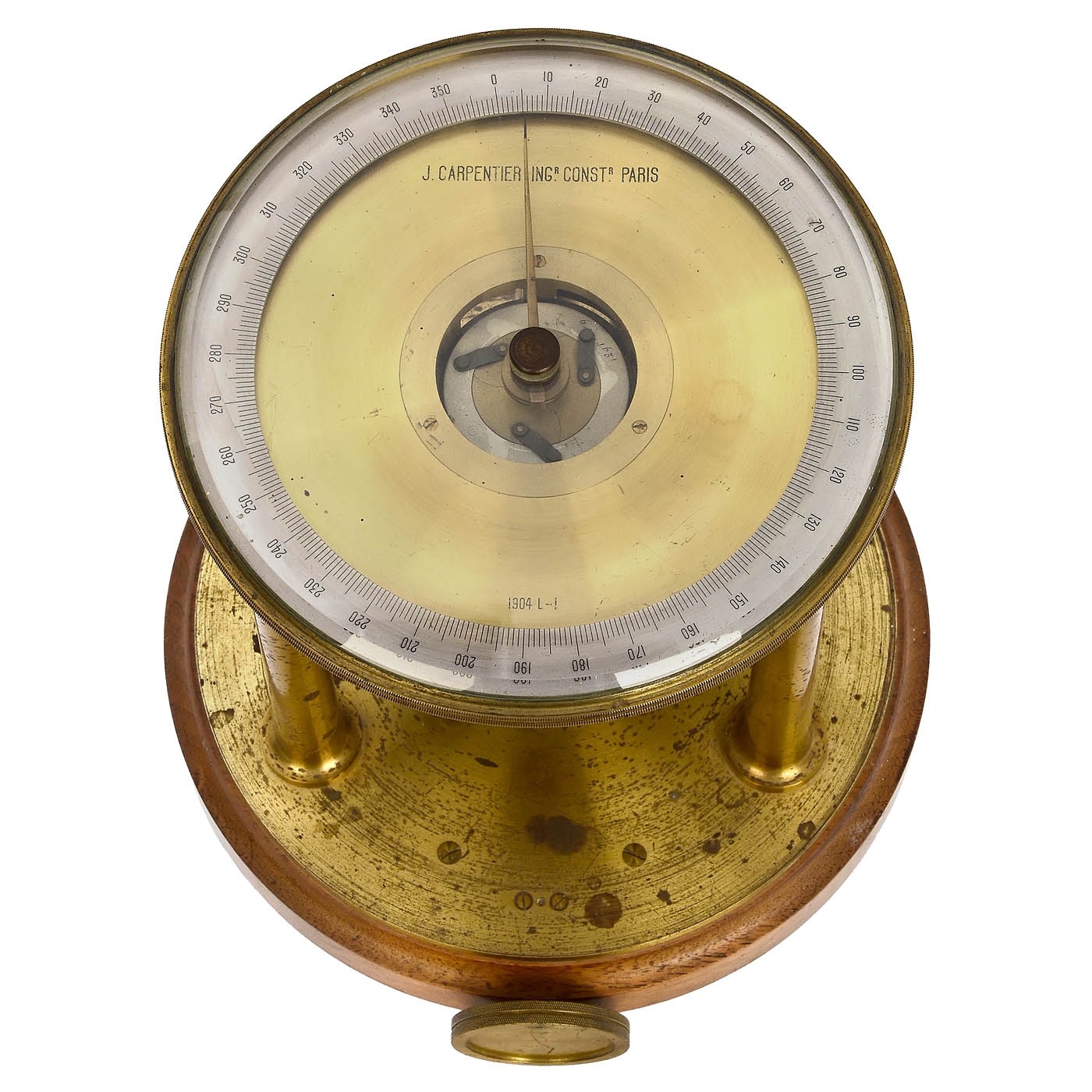 J. Carpentier, Paris. Original lacquered brass, rotating horseshoe magnet, 360˚ scale, on walnut base, Ø 11 3/5 in., height 13 1/3 in. - Note: The hysteresis meter was mainly used in metallurgy to test the quality of iron, steel and ferromagnetic alloys.