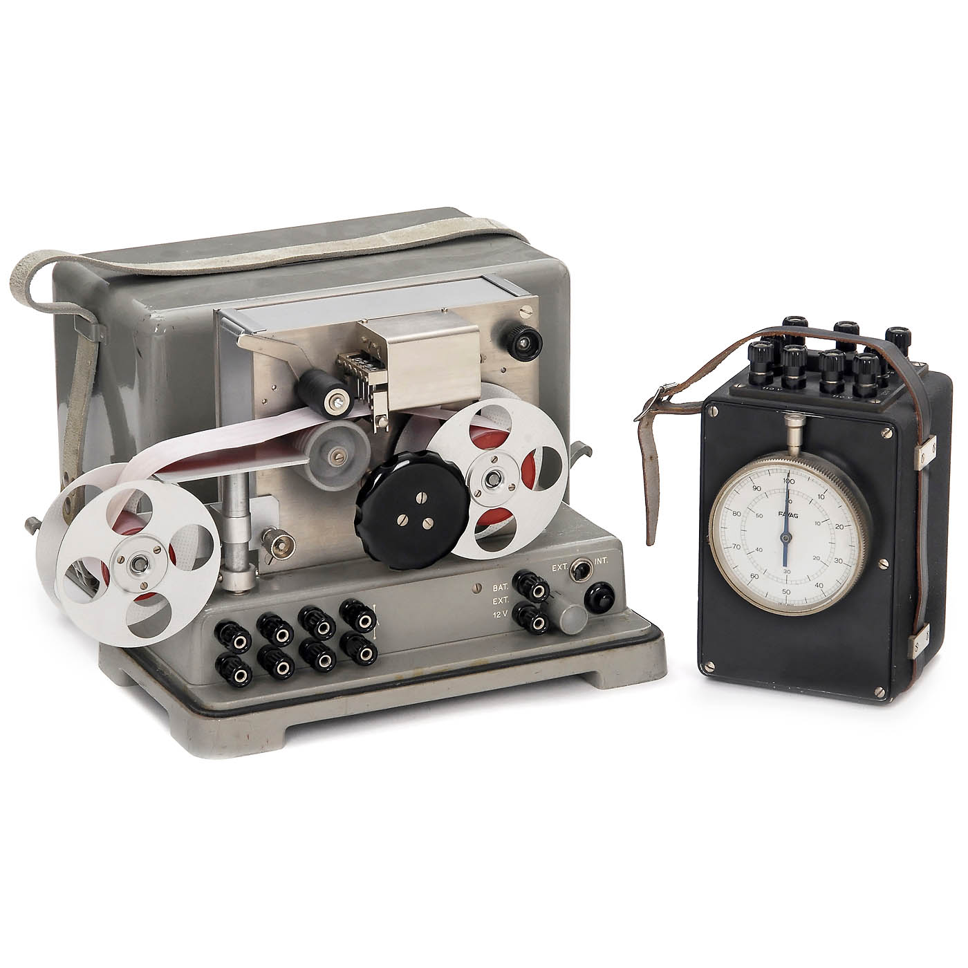FAVAG/Neuchâtel. 1) Control unit for a time interval, with time clock and plug-in contacts with French lettering, 110/220 volts, suitable e.g. for a tachistoscope. - And: 2) Tape chronograph, similar construction to a Morse receiver, spring-drive, with 4 needles instead of pins to produce a series of fine punctures on the paper tape, for reproduction in graphic form the time record of a chronometer and the ocular micrometer of an astronomical theodolite, with lid.