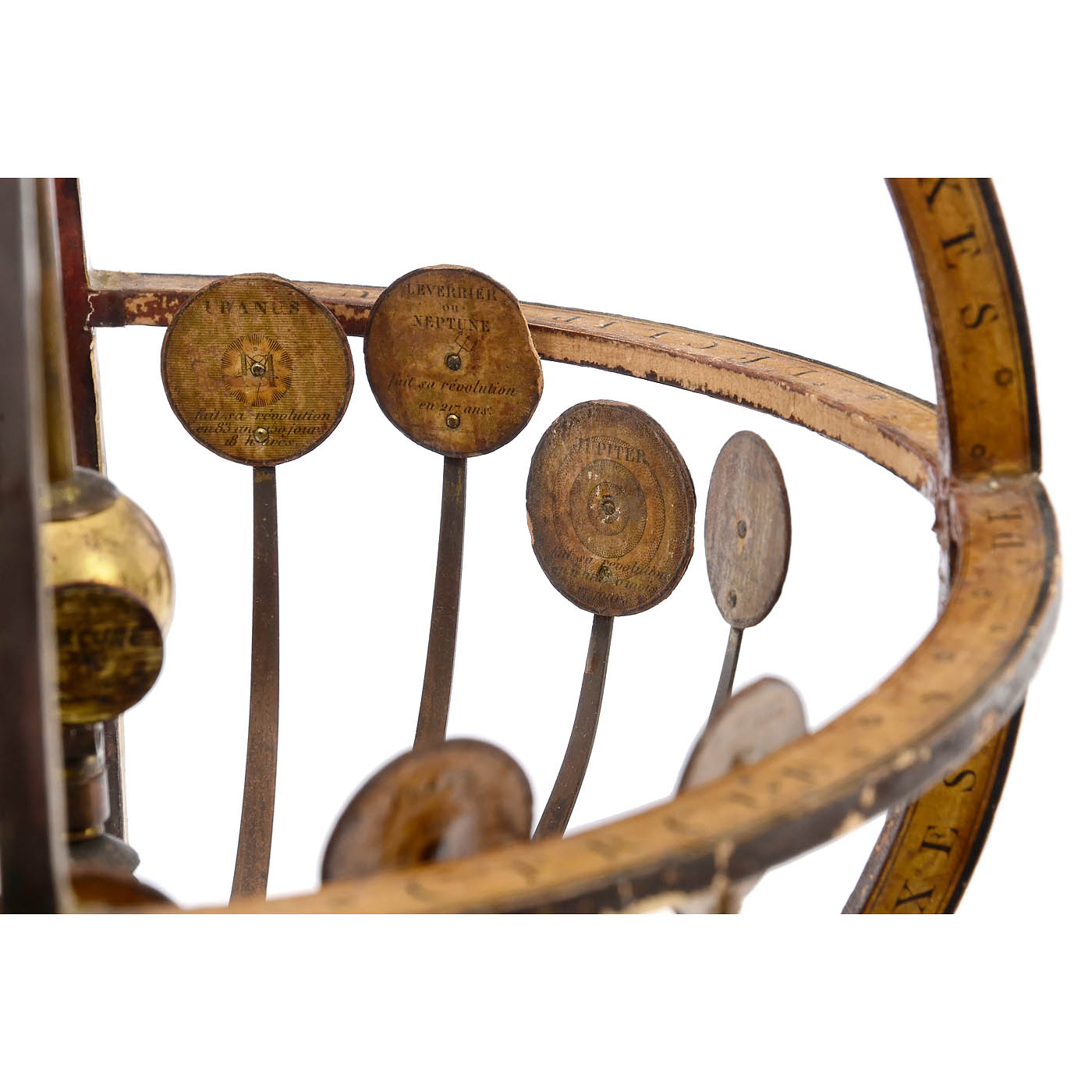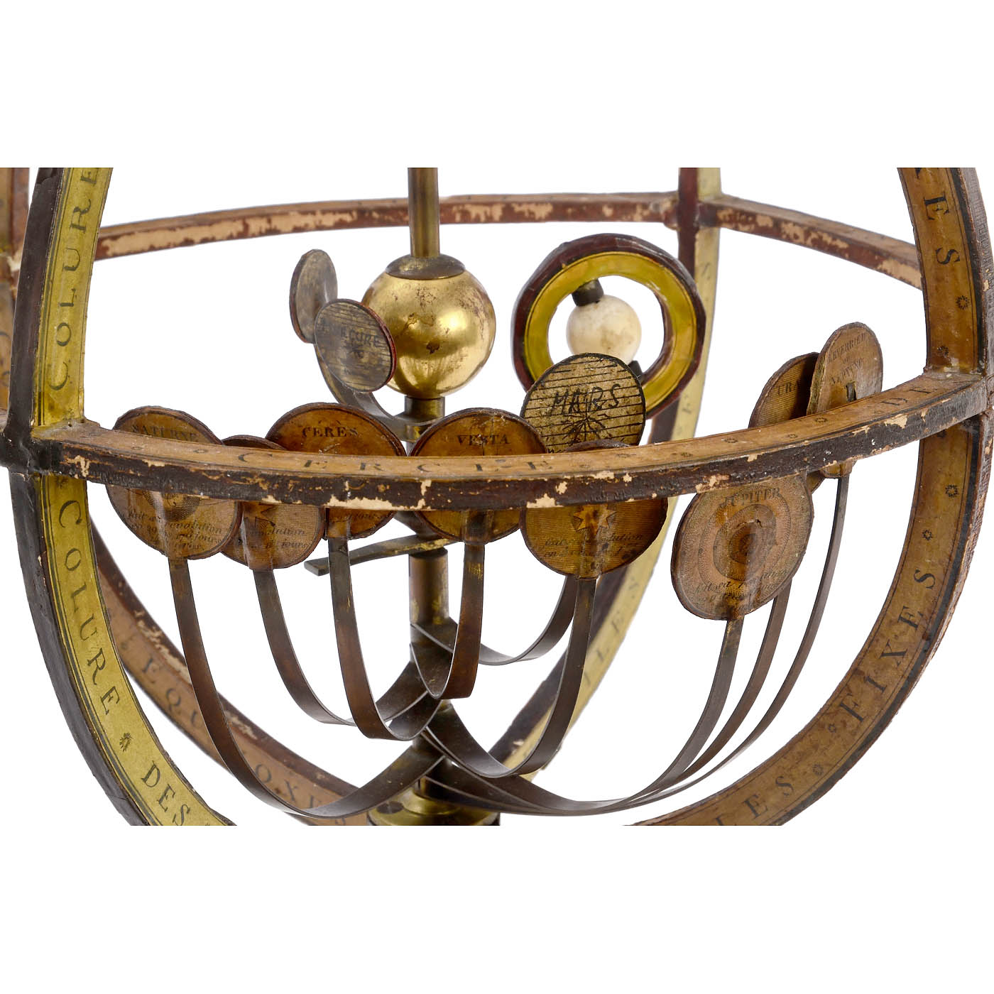 France, brass and wood, with central brass solar sphere, bone Earth globe, mechanism with two pulleys and thread for the rotation of the meridian with moon around the earth, eleven moveable metal arms with card discs labeled on both sides for the planets and asteroids Neptune, Uranus, Saturn, Pallas, Jupiter, Ceres, Juno, Vesta, Mars, Venus and Mercury and paper-covered wood meridians inscribed in French: "Colure des Equinoxes", "Etoiles Fixes", "Colure des Solstices", "Cercle de l'Ecliptique", Ø 10 in., total height 17 ½ in.