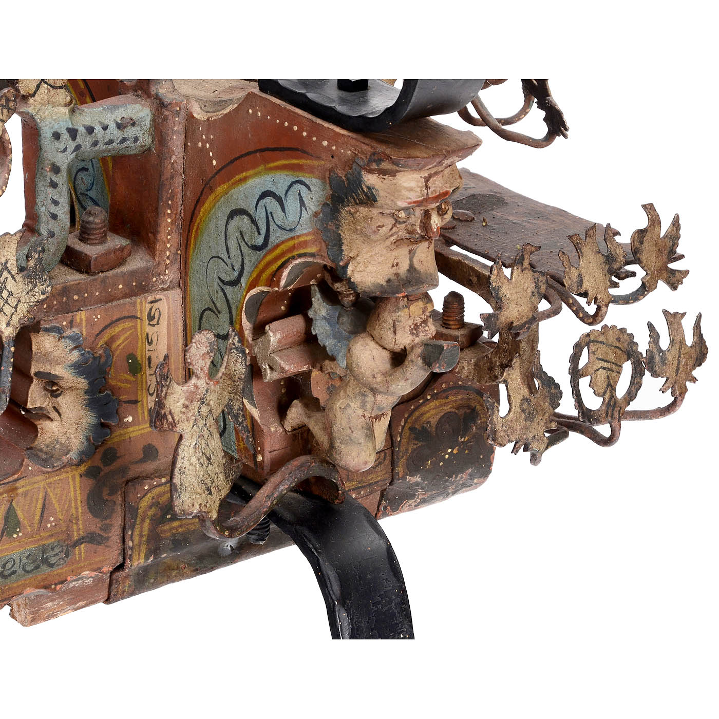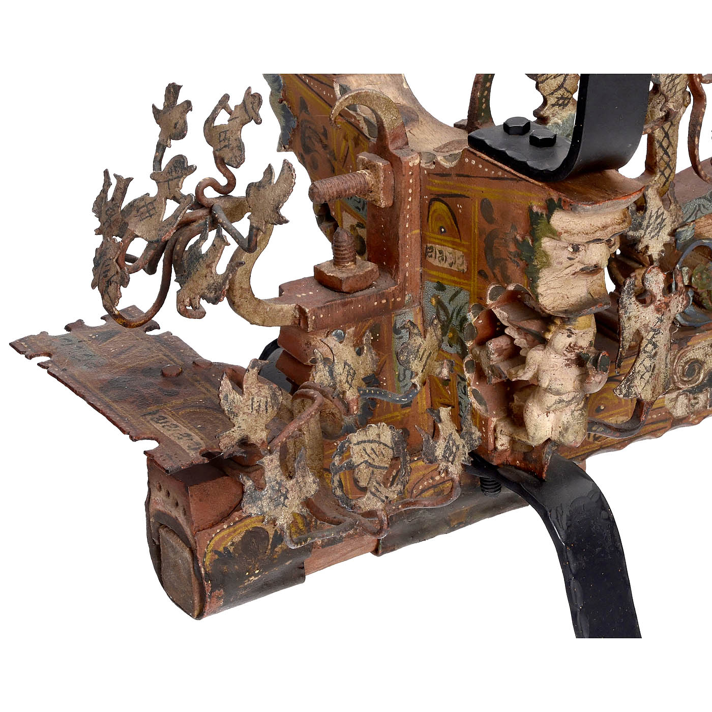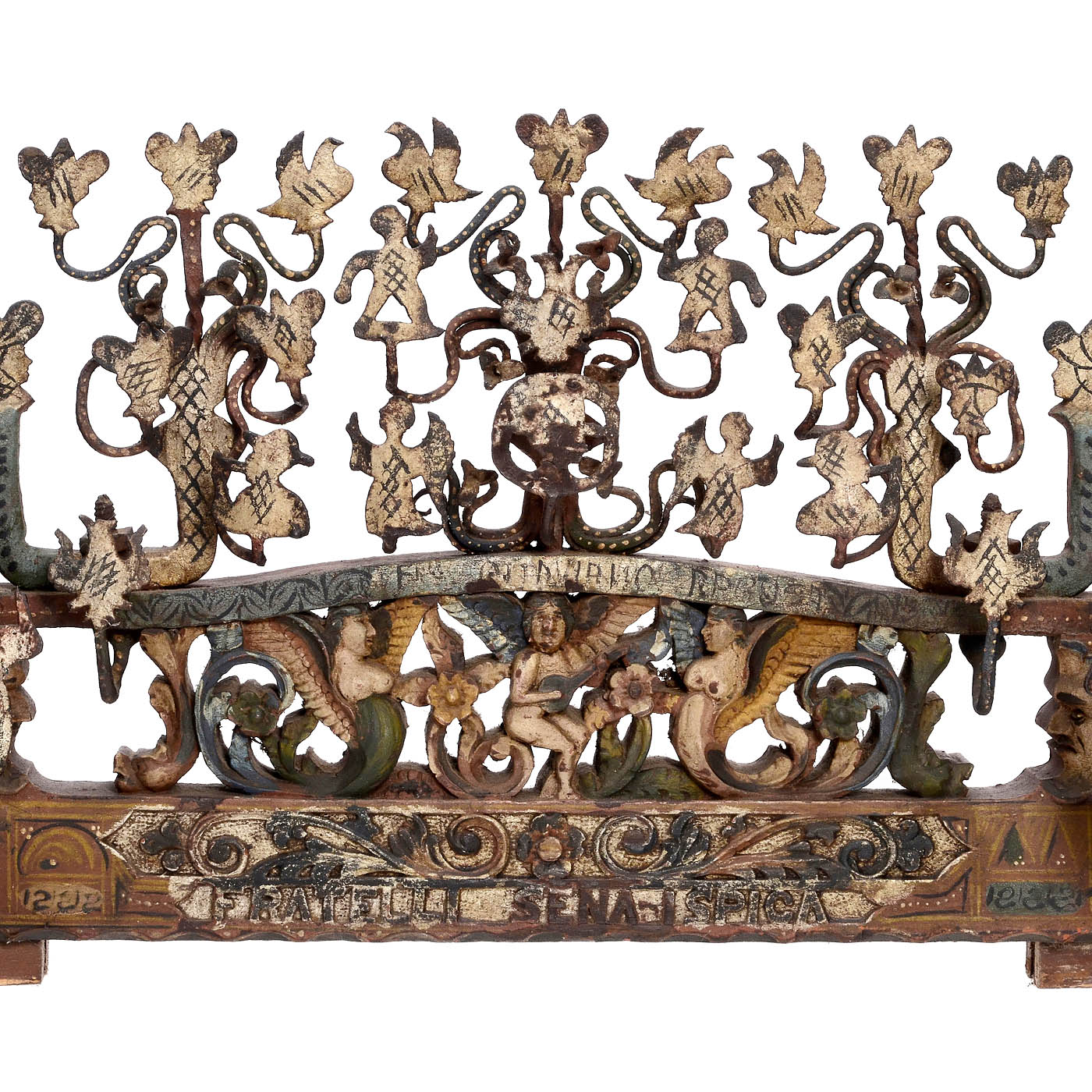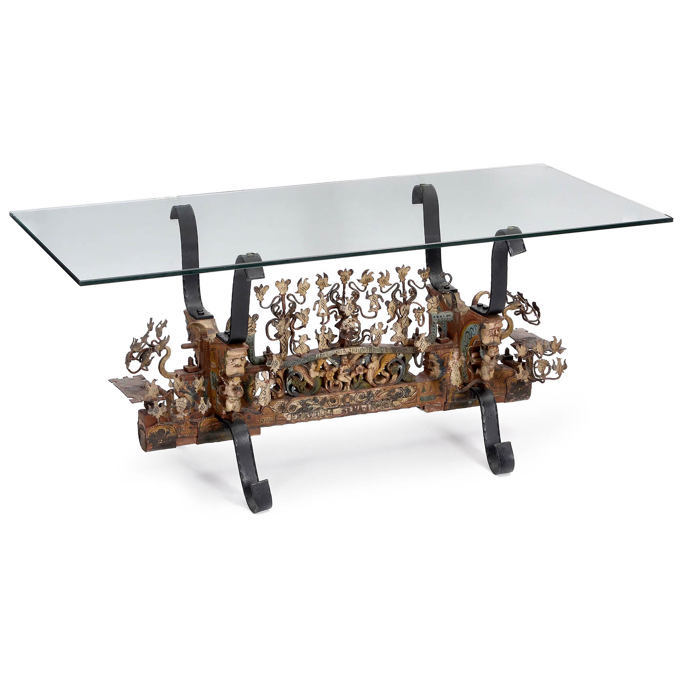 Sicilian cart axle base from c. 1900, with wrought and carved decoration, elaborate painted motifs of grotesques, angels and animals, the carved name of the former owner "Fratelli Sena I Spica", wrought-iron bands forming the feet, a large glass top with polished edges, one corner with minor chips, overall 55 x 23 3/5 x 23 1/5 in. - A decorative rarity.