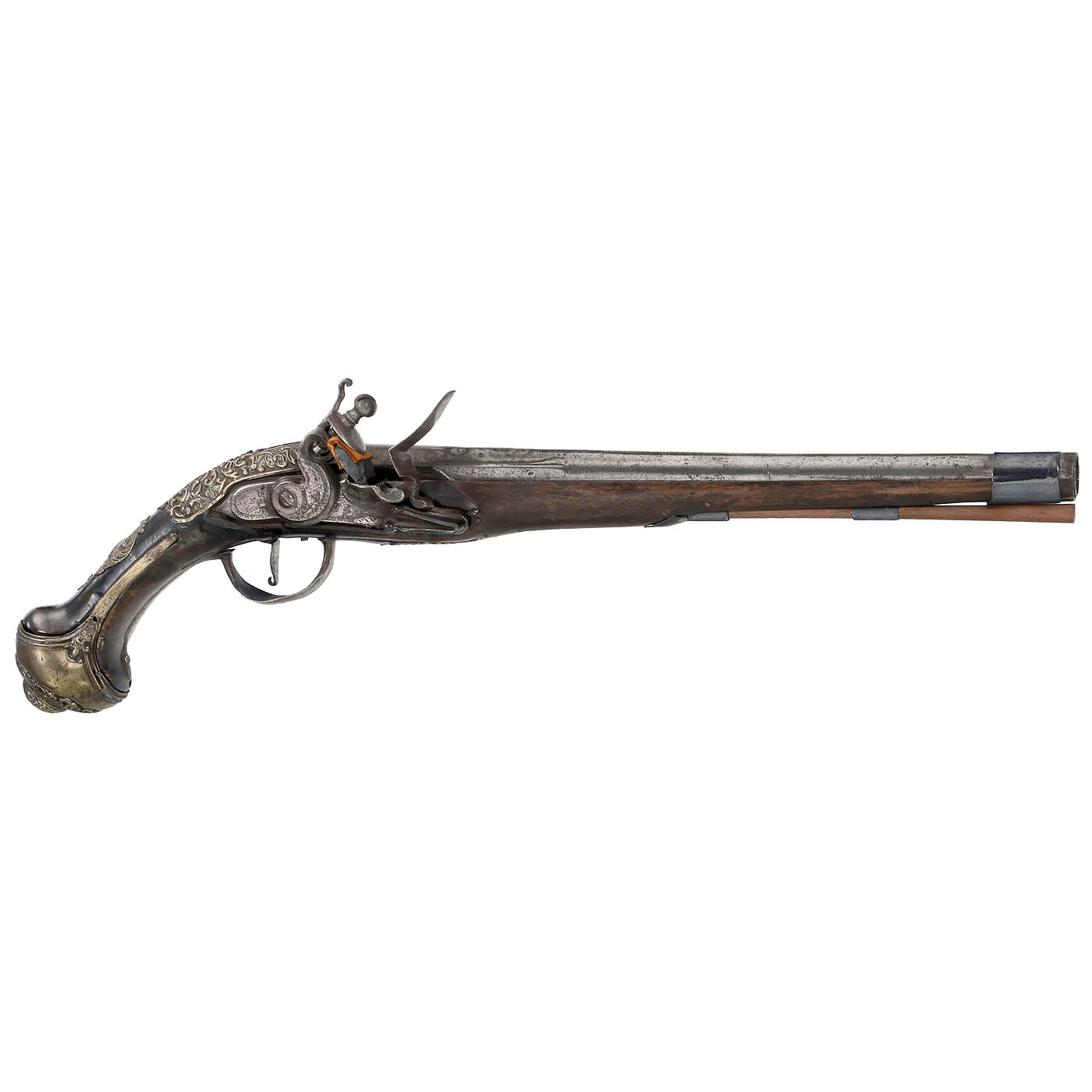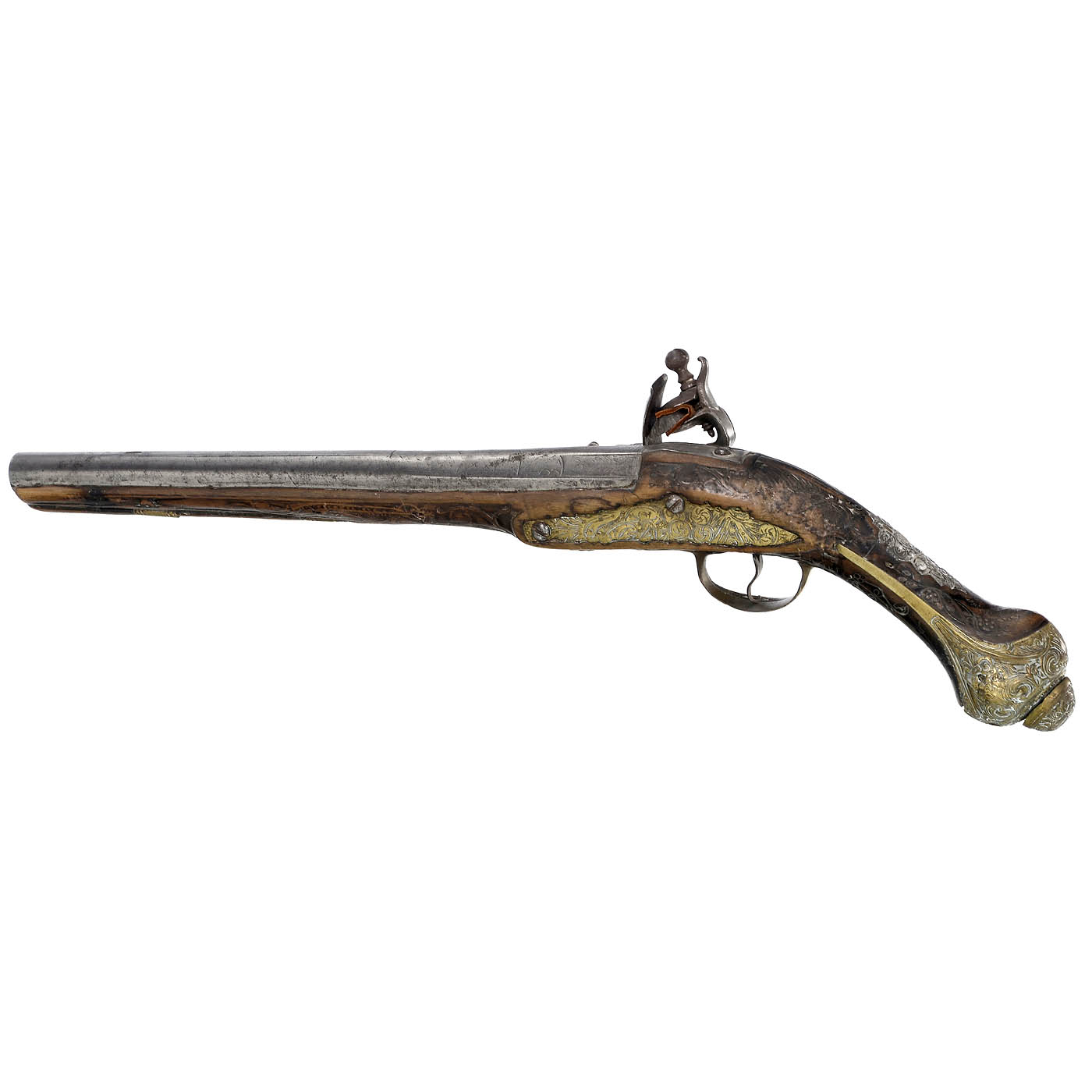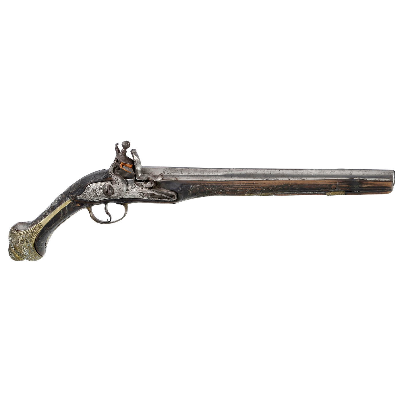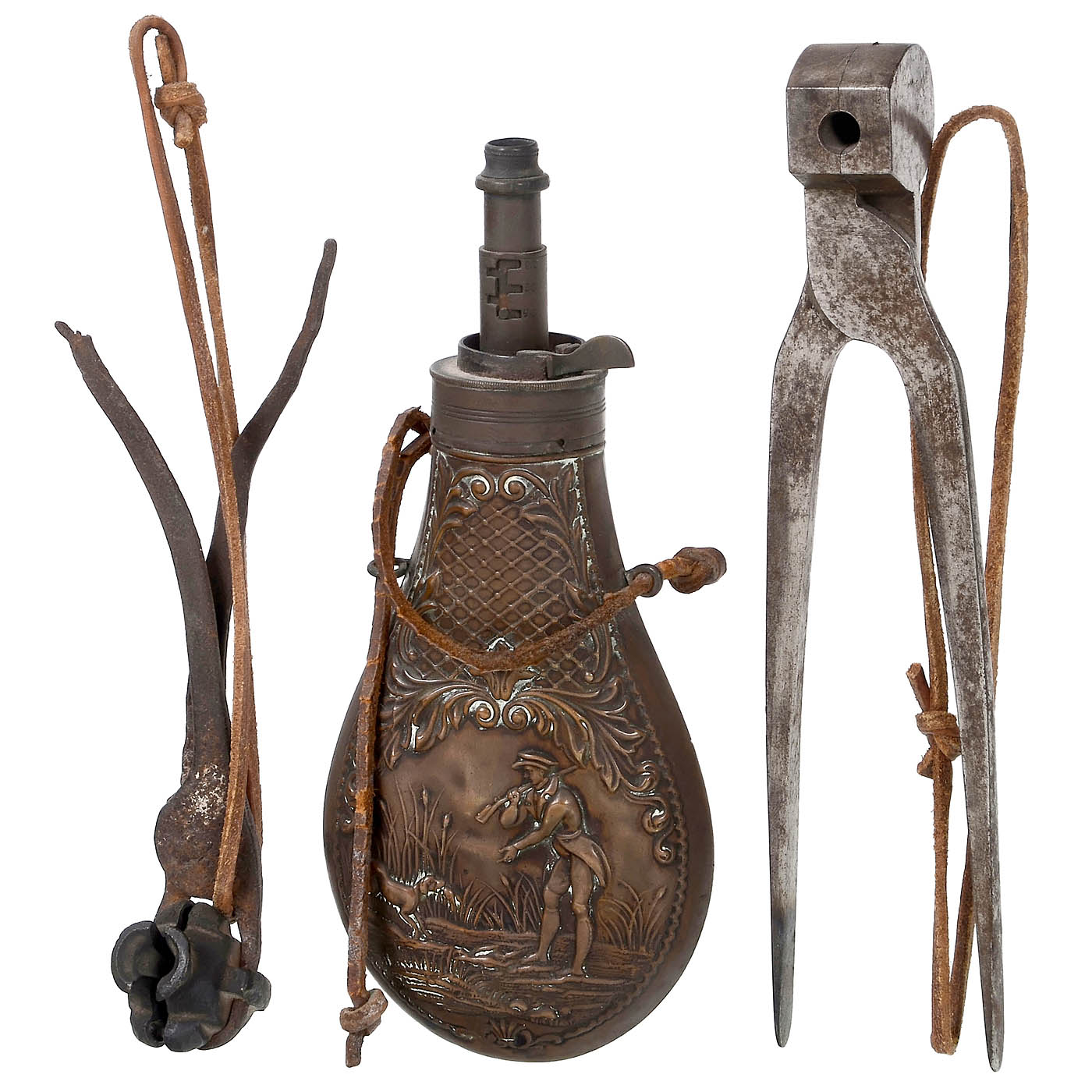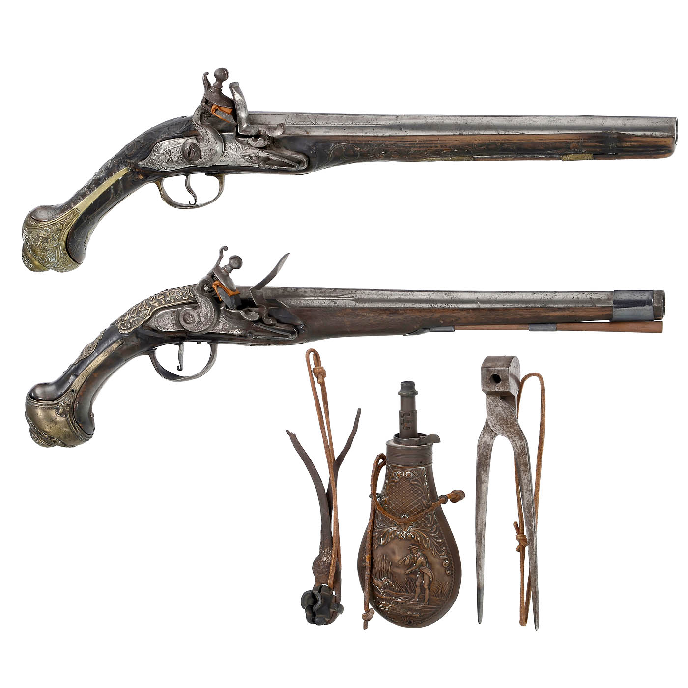 1) Flintlock pistol, octagonal barrel tapering to a round, smooth bore, 16 mm calibre, ornamentally engraved flintlock, carved walnut stock, grip with brass inlay, brass lock side plate, brass grip cap in relief, ramrod not removable, length 19 5/8 in. - 2) Flintlock pistol, octagonal barrel tapering to a round, smooth bore, 16 mm calibre, walnut stock, iron flintlock, ornamental brass fittings, ramrod replaced, length 20 in. - 3) Powder flask, copper, hunting motif embossed on both sides. - And: 4) 2 ball tongs, iron, for round balls calibre 16 and 17 mm.
