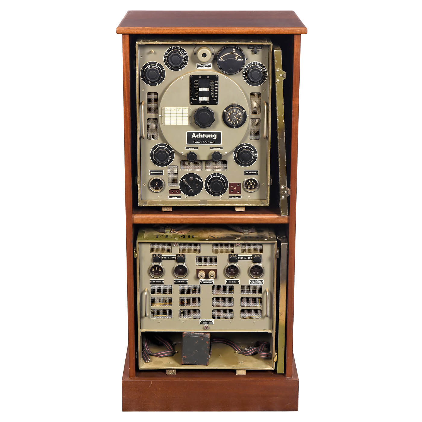 Apparate- und Maschinenfabriken, formerly Zellweger A.G. Uster. 1) Uster E41 all-wave receiver, 12 tubes, long wave, medium wave and several short-wave bands, mains or battery supply, 10 coil sets for frequency change, "Revue" station clock next to coil slot. - 2) Power supply unit E41WR, for powering the receiver E41. - 3) Transmitter of the radio station FL40, 6 tubes, long wave, medium wave and short wave, "Revue" station clock. - 4) Rectifier for operating the FL40 radio station. - 5) FL40LG charger. - And: 6) Electric motor with generator FL40 No. R16 with protective cover. - With accessories and manual in later shelves.