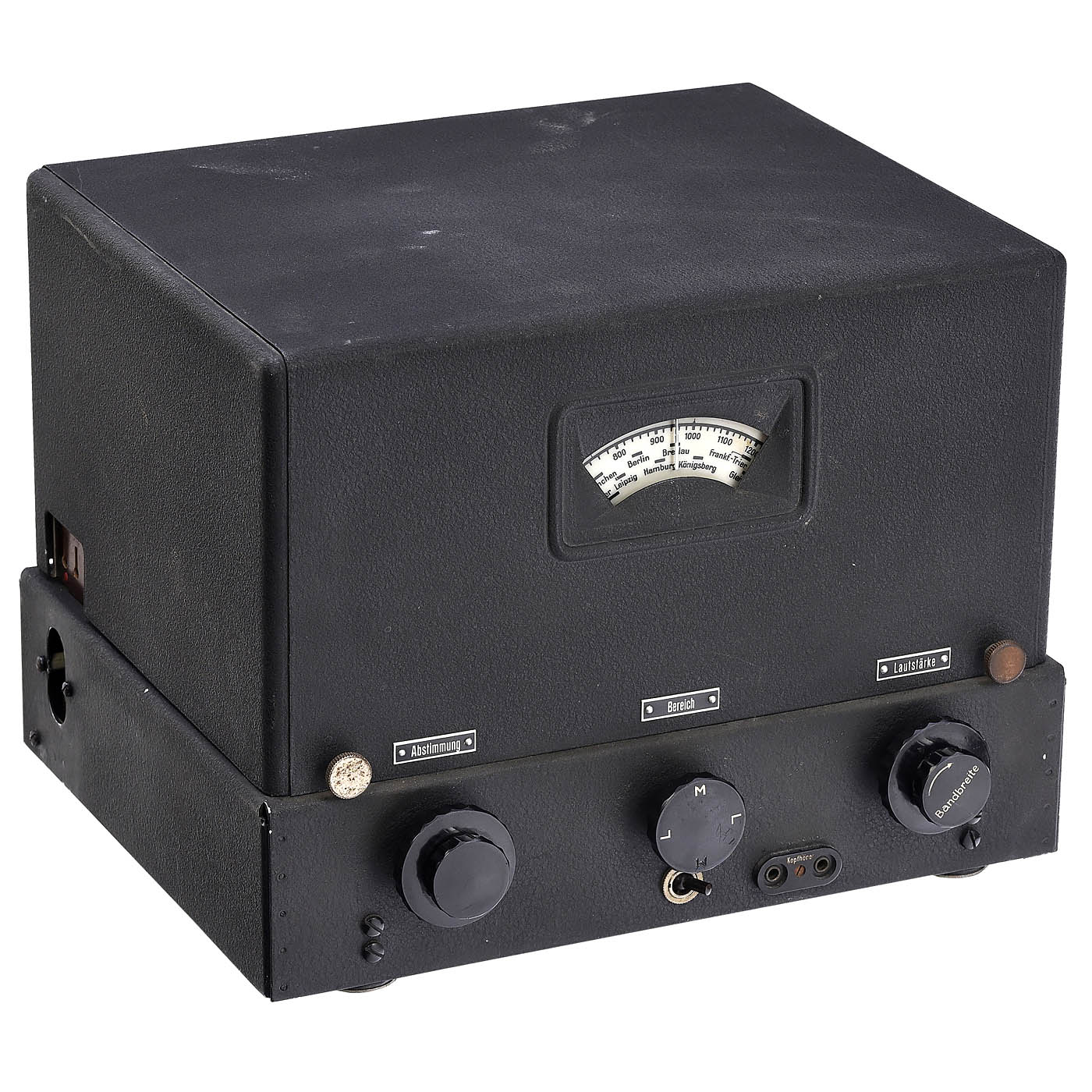 Lorenz, Berlin. 1) Community radio receiver, identical in construction to Klangfilm 30700, 4 tubes, long wave and medium wave, for headphones or AF amplifier, 110-240 volts AC, in metal case. - And: 2) Kurmark amplifier, 4 tubes, 110-240 volts AC, for external loudspeaker. Both complete with tubes and all components. Good condition and (according to the consignor) working.