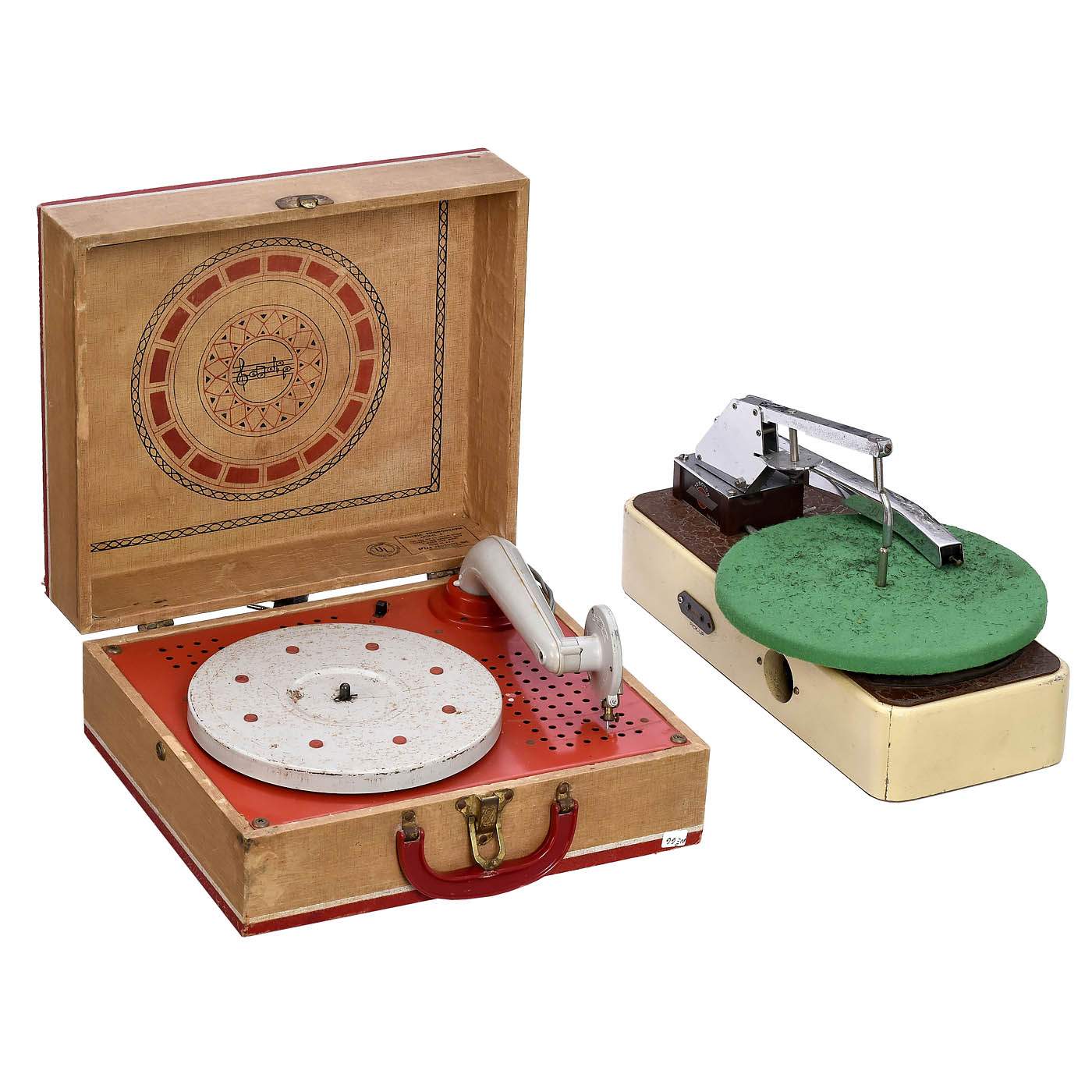 1) Joboton 10, record changer, c. 1948, Jobo N.V., Amsterdam, for 78-rpm discs, wood case, 220 V, for amplifier, extremely rare. - 2) Dual 55E record player, c. 1938, Gebrüder Steidinger, St. Georgen, Black Forest,78 rpm, centrifugal force control, pick-up for steel needles, 110-220 volts AC, wood case with sliding flap. - 3) Sonneclair radio, c. 1938, Hannecart & Dannay, Fourmies, Paris, wood case. - 4) Electric pick-up, Pathé, with cables in box. - 5) Model 2019 loudspeaker, Philips, heptagonal bakelite case with brass front, Ø 11 ¾ in. - 6) Model 6 electric record player, Spear Product, USA, 115 volts. - 7) 2 frames with radio components, function unknown. - And: 8) Horn loudspeaker, Brunet & Cie, Paris, 4000 ohms.