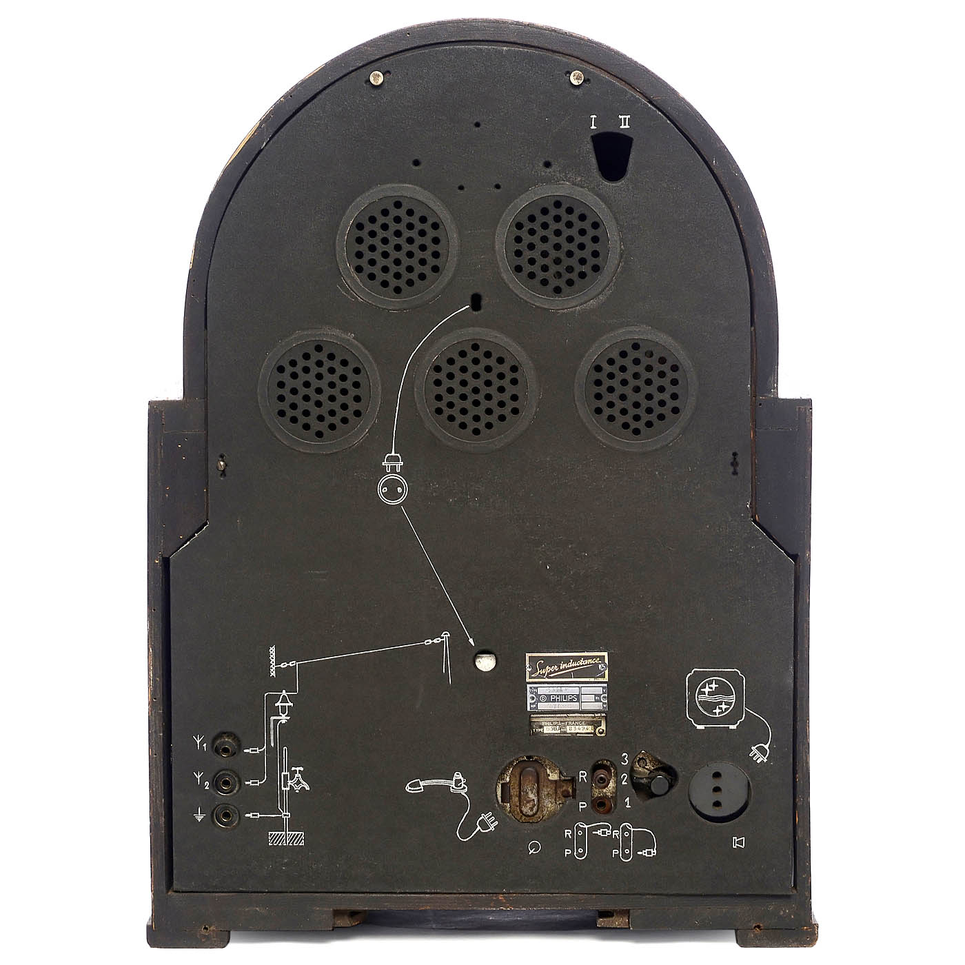 Philips, Paris, France. Cathedral-type eight-tube mains receiver, alternating-current supply (AC) 103-253 volts, broadcast (MW) and long wave, permanent dynamic magnetic loudspeaker type 2165 with 10 ohms, wood case, original rear panel.