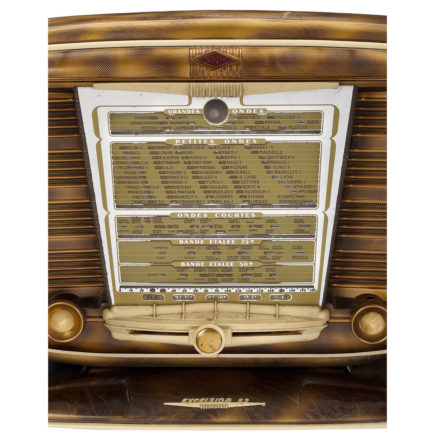 S.N.R., Paris. With 6 tubes, 3 wave ranges, mains-powered, magic eye, 2 inbuilt loudspeakers, metal case, model name complete, mirror scale in good condition, a very sought-after radio.