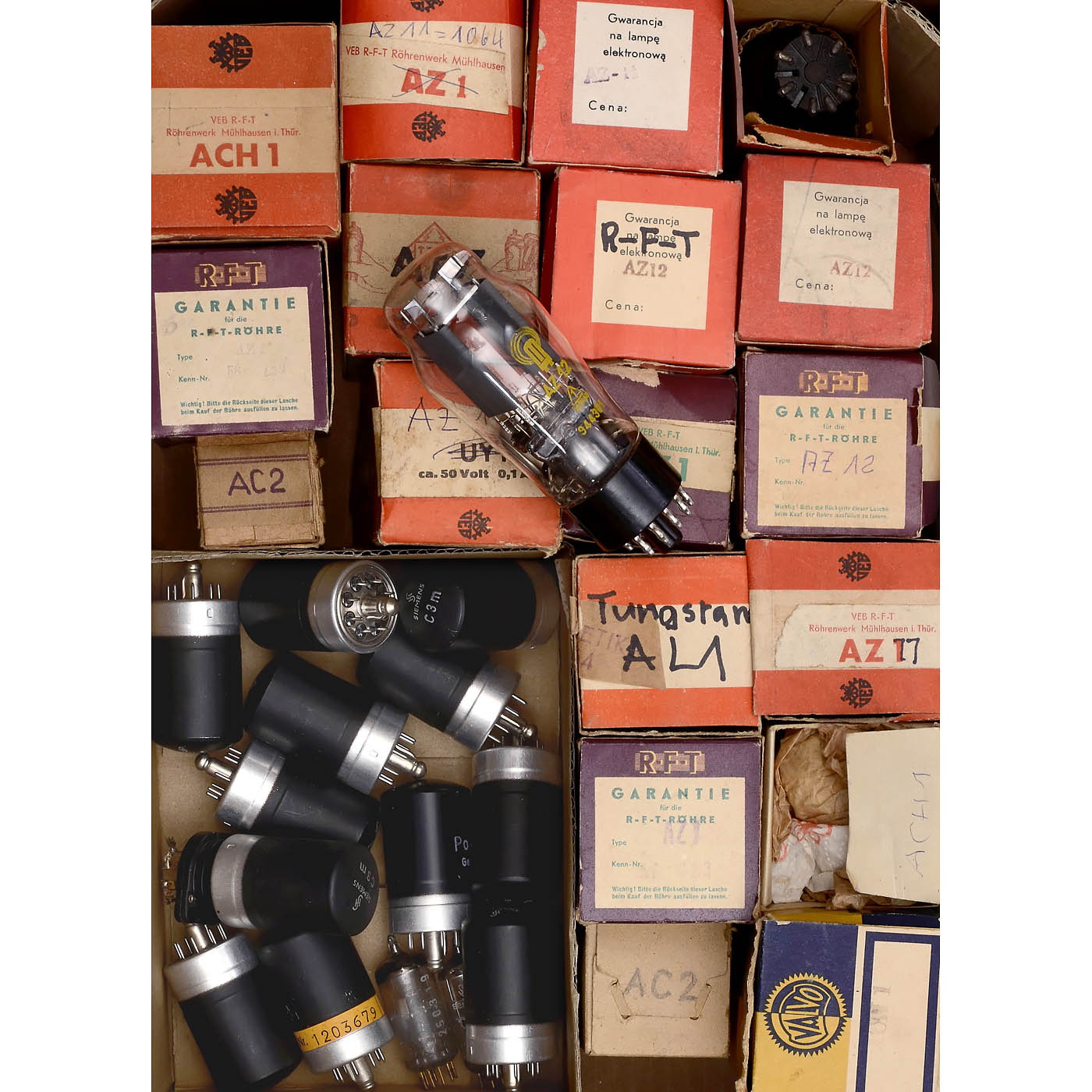 Manufacturers: Telefunken, Valvo, Tungsram, Philips, RFT and Siemens. 1) 19 x KC1, triode. - 2) KL2, pentode. - 3) 2 x KL1, pentode. - 4) KB2, duodiode. - 5) KL4, pentode. - 6) KF3, pentode. - 7) EBF2, duodiode. - 8) 26NG, rectifier. - 9) 6 x EYY13, rectifier. - 10) 3 x EF39, pentode. - 11) EL12N, pentode. - 12) 2 x EL11, pentode. - 13) 4 x EL12, pentode. - 14) ECL11, triode. - 15) EL2, pentode. - 16) 2 x EL12/375, pentode. - 17) EL5, pentode. - 18) 4 x ECH4, triode heptode. - 19) 2 x EBL21, double diode pentode. - 20) 2 x EBC33, double diode pentode. - 21) EF9, pentode. - 22) ECH21, triode heptode. - 23) 2 x ECH35, triode-hexode. - 24) EZ12, two-way rectifier. - 25) 3 x ACH1, triode-hexode. - 26) 3 x AZ11, two-way rectifier. - 27) AL4, pentode. - 28) 4 x AZ1, two-way rectifier. - 29) AF7, pentode. - 30) 3 x AZ12, two-way rectifier. - 31) 2 x AC2, triode. - And: 32) AL1, pentode.