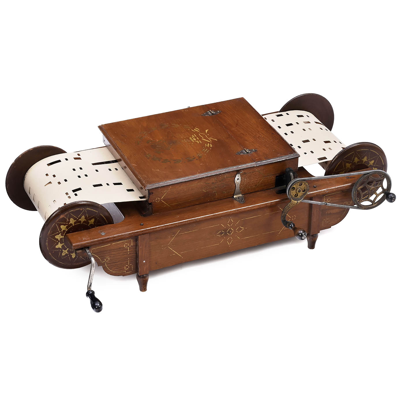 The Mechanical Orguinette Co., New York. For perforated paper rolls, 14 notes, unusual winding mechanism with 2 pulleys, width 26 3/4 in., good original condition, plays too softly, with 12 rolls.